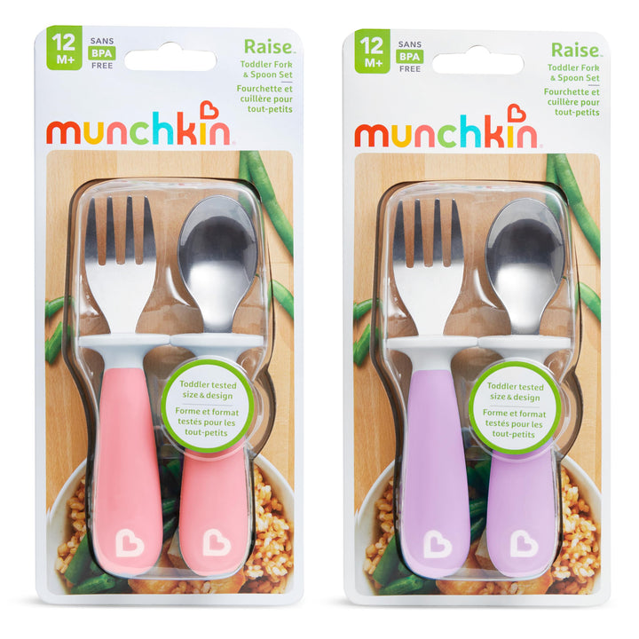 • Original Flatware Sets – ® Raise™ Toddler Fork and Spoon Utensil Set, Rest Keeps Tip Off Table, BPA Free, 4 Pack, Pink/Purple by Munchkin