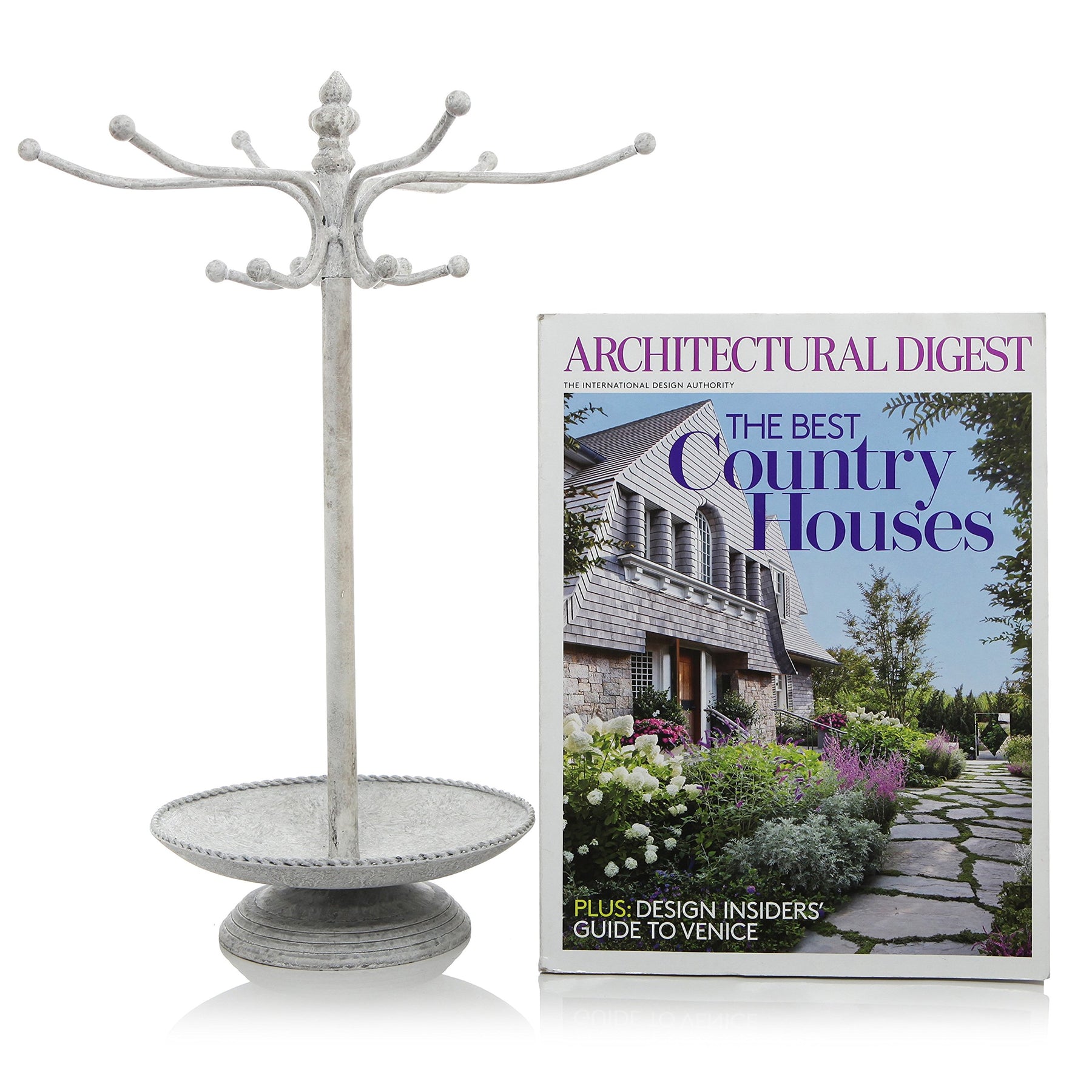 - Original Jewelry Towers – Vintage White Metal Necklace and Bracelet Organizer Jewelry Stand with 12 Hooks and Ring Dish Tray, Multipurpose Accessory and Keychain Holder Display Rack by MyGift