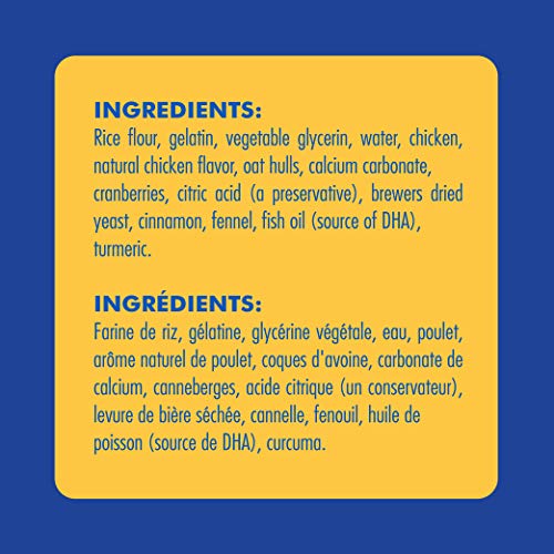 | ingredients | Rice flour, gelatin, vegetable glycerin, water, chicken, natural chicken flavor, oat fiber, calcium carbonate, cranberries, citric acid (a preservative), brewers dried yeast, cinnamon, fennel, fish oil(source of DHA), turmeric |