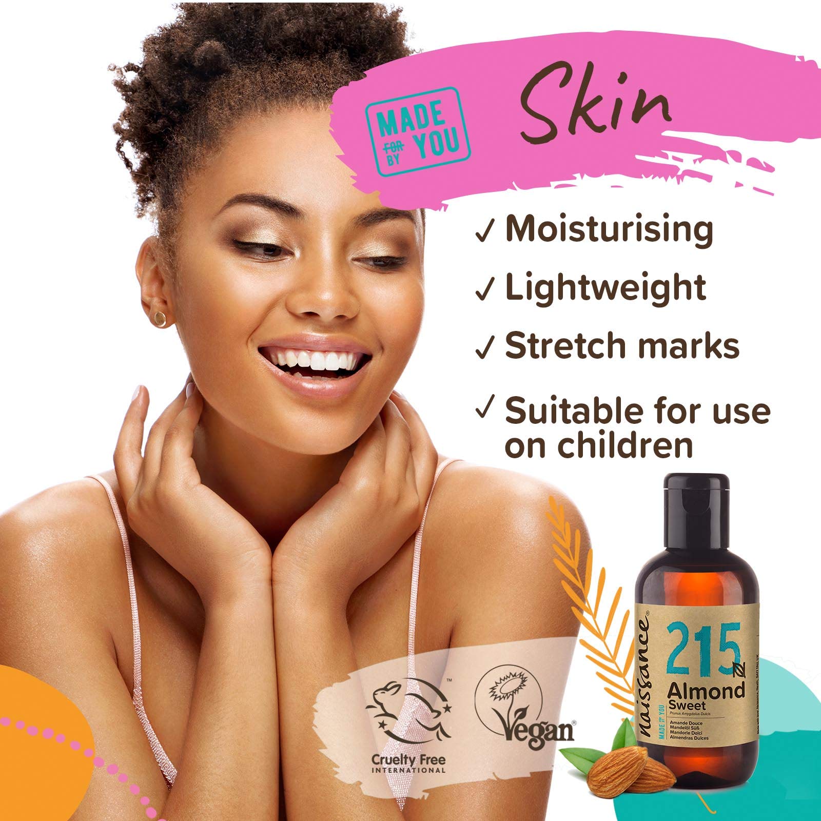 Massage: An excellent oil for massage, Almond Oil is one of the preferred base oils for professional massage and massage therapy. The oil helps the hands glide across the skin and has the ideal speed of absorption for performing massage - stays on the skin long enough to perform a massage, keeping the skin moisturised but not oily.