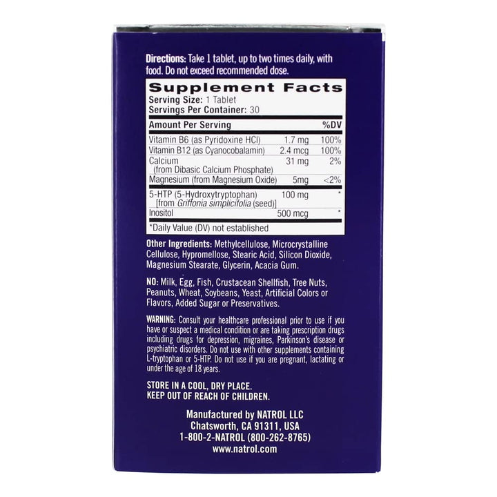 | ingredients | Dietary Ingredients: Vitamin B6 (as Pyridoxine HCl), Vitamin B12 (as Cyanocobalamin), Calcium (from Dibasic Calcium Phosphate), Magnesium (from Magnesium Oxide), 5-HTP (5-Hydroxytryptophan)from Griffonia simplicifolia (seed), Inositol. Other Ingredients: Methylcellulose, Microcrystalline Cellulose, Hypromellose, Stearic Acid, Silicon Dioxide, Magnesium Stearate, Glycerin, Acacia Gum. |