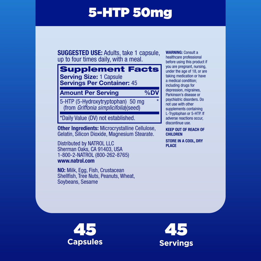 - Mood and Stress Support Supplement*: Contains one 45 count bottle of Natrol 5-HTP 50mg capsules for a 11- to 45-day supply.