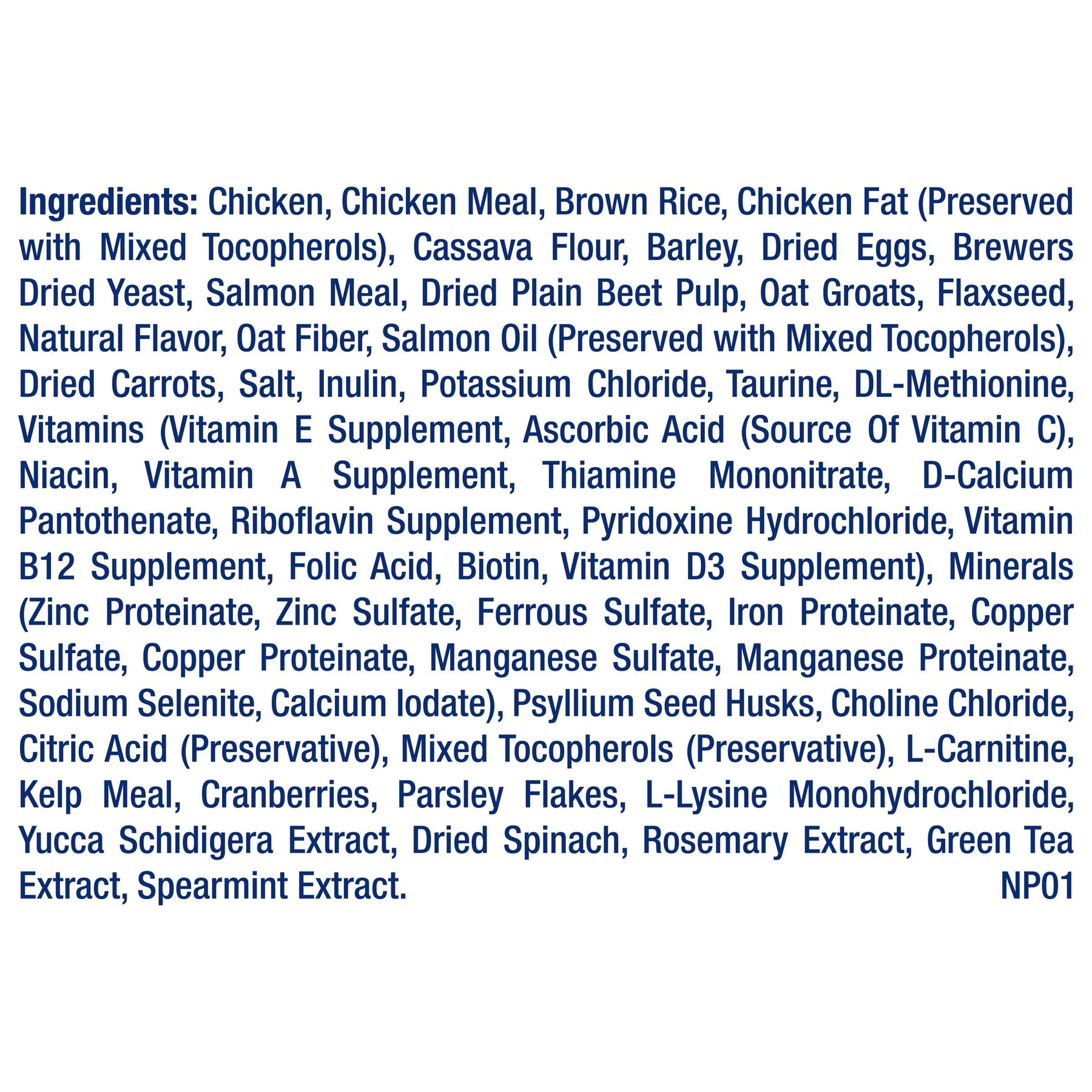 | ingredients | Chicken, Chicken Meal, Brown Rice, Barley, Brewers Dried Yeast, Dried Beet Pulp, Chicken Fat (Preserved with Mixed Tocopherols), Lamb Meal, Dried Eggs, Oat Groats, Salmon Meal, Oat Hulls, Natural Flavor, Flaxseed, Carrots, Salmon Oil (Preserved with Mixed Tocopherols), Salt, Potassium Chloride, Inulin, Taurine, Minerals (Zinc Proteinate, Zinc Sulfate, Ferrous Sulfate, Iron Proteinate, Copper Sulfate, Copper Proteinate, Manganese Sulfate, Manganese Proteinate, Calcium Iodate, Sodium Selenite), Psyllium Seed Husks, Vitamins (Vitamin E Supplement, Niacin, D-calcium Pantothenate, Vitamin A Supplement, Riboflavin Supplement, Thiamine Mononitrate, Vitamin D3 Supplement, Pyridoxine Hydrochloride, Folic Acid, Biotin, Vitamin B12 Supplement), Citric Acid (Preservative), Choline Chloride, Mixed Tocopherols (Preservative), Dried Spinach, Parsley, Dried Cranberries, Dried Kelp, L-carnitine, L-lysine Monohydrochloride, Yucca Schidigera Extract, Rosemary Extract, Green Tea Extract, Spearmint Extract. |