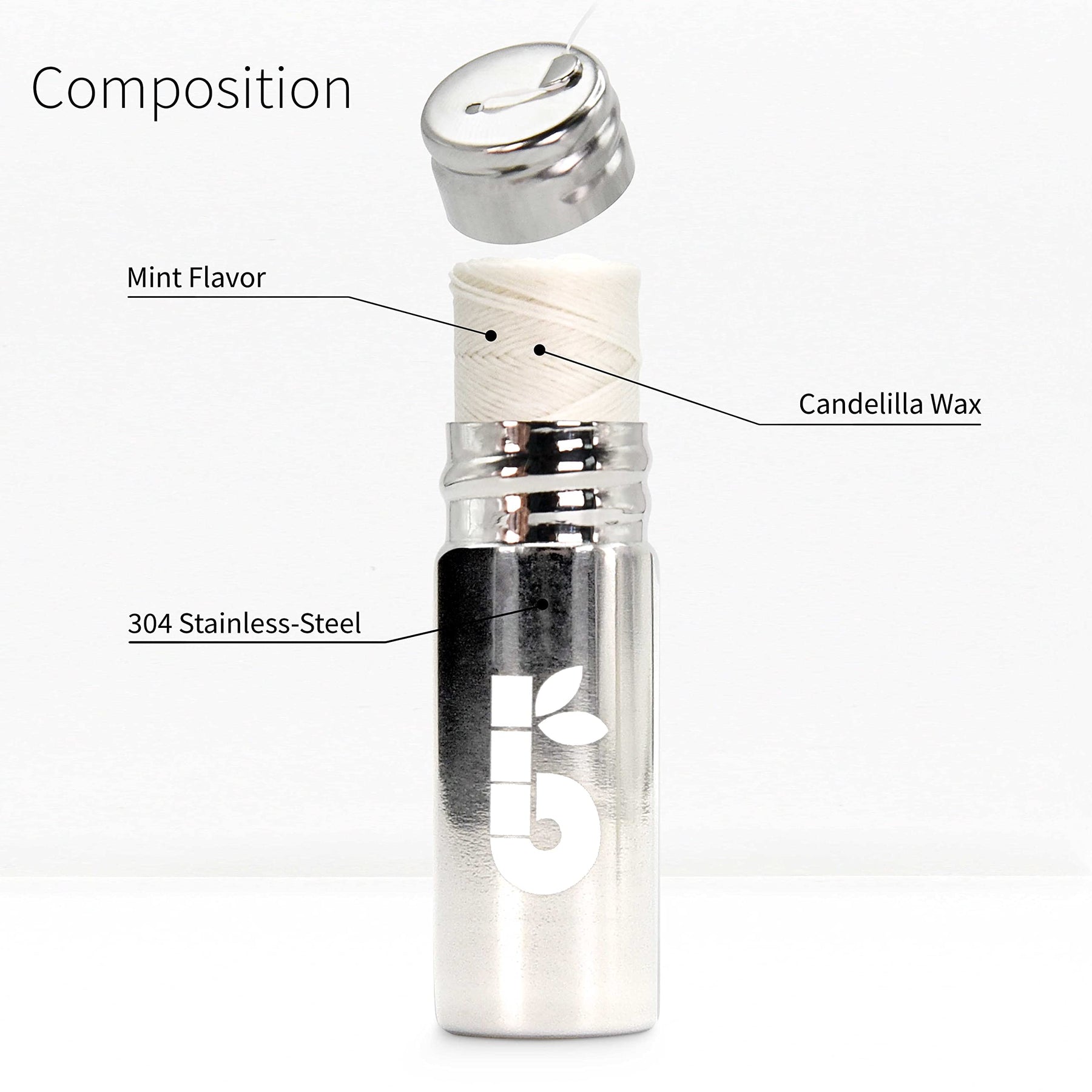 Our tooth floss dispenser is refillable and made from sturdy stainless steel, you can re-use it for years. The eco dental lace is made of silk and coated with Candelilla wax, all natural and biodegradable. The dental tape comes with a minty flavor for a refreshing flossing experience.