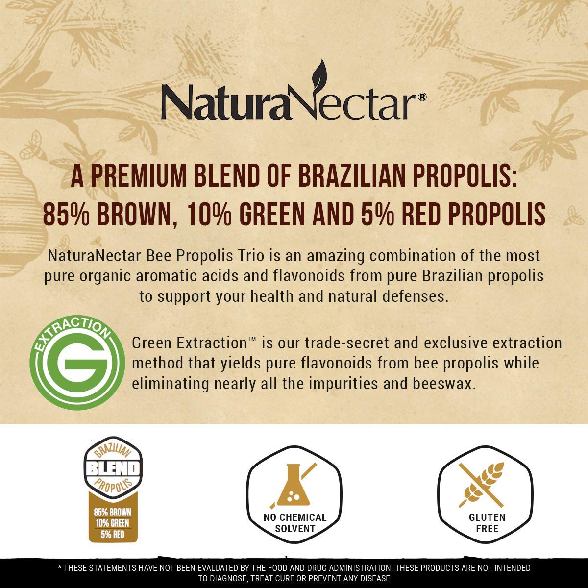 - AMAZING BEE PROPOLIS TRIO: NaturaNectar Trio Bee Propolis combines pure, premium Brazilian products with 85% brown, 10% green, and 5% red bee propolis, offering exclusive benefits like antioxidants and health support. These gluten-free capsules provide a bee powered daily health support and promote overall well-being. Suitable for adults, this NSF-certified supplement delivers the natural potency of bee propolis in easy-to-take capsules, perfect for daily vitality and enhanced wellness.