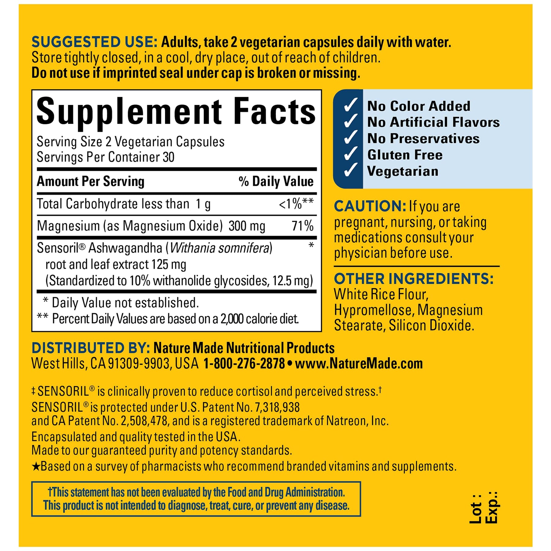 - 30-DAY SUPPLY: Contains a 30-day supply of Nature Made’s Calm & Relax ashwagandha and magnesium supplement, 60 vegetarian capsules per bottle, 2 per day.