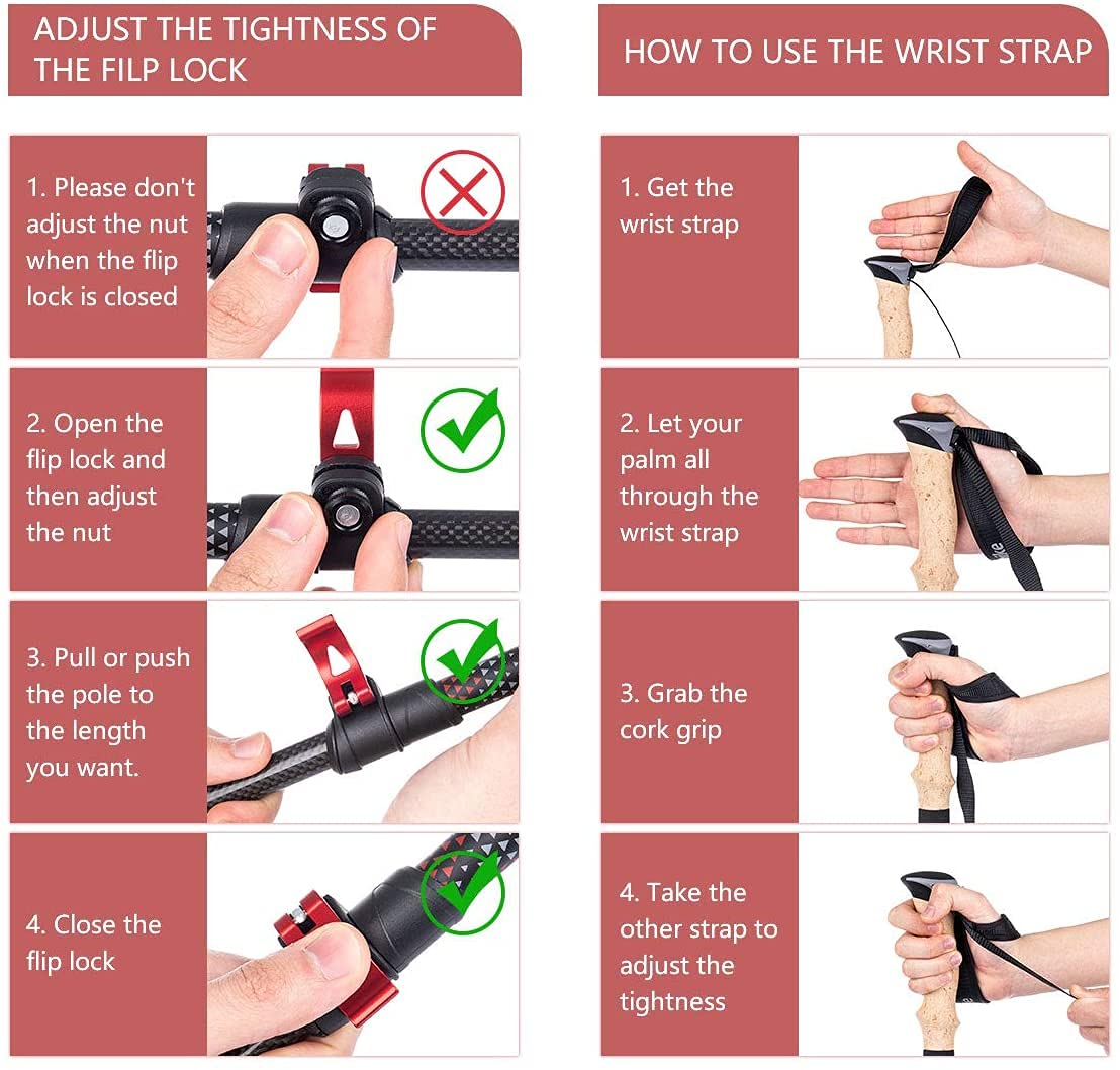 - [COMFORTABLE EVA GRIPS] Using ergonomic anti-slip natural cork grip handle, precisely accommodate your palm, absorb sweat and keep your hands comfortable throughout your hike. The extended foam sleeves, made of soft EVA foam, will aid you during switchbacks and abrupt changes in terrain. Our walking poles also come with adjustable high density nylon wrist straps that provide extra comfort and balance in every use.