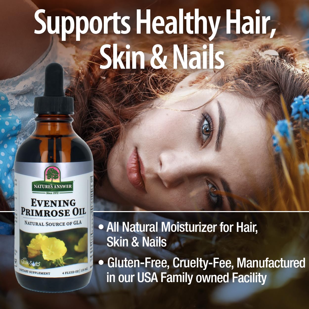 - Original Evening Primrose – Nature's Answer Liquid Evening Primrose Oil 4oz Liquid, Cold Pressed, Essential All Natural Moisturizer for Hair, Skin, Nails, Rosacea Psoriasis Eczema Relief, Single Count by Nature's Answer