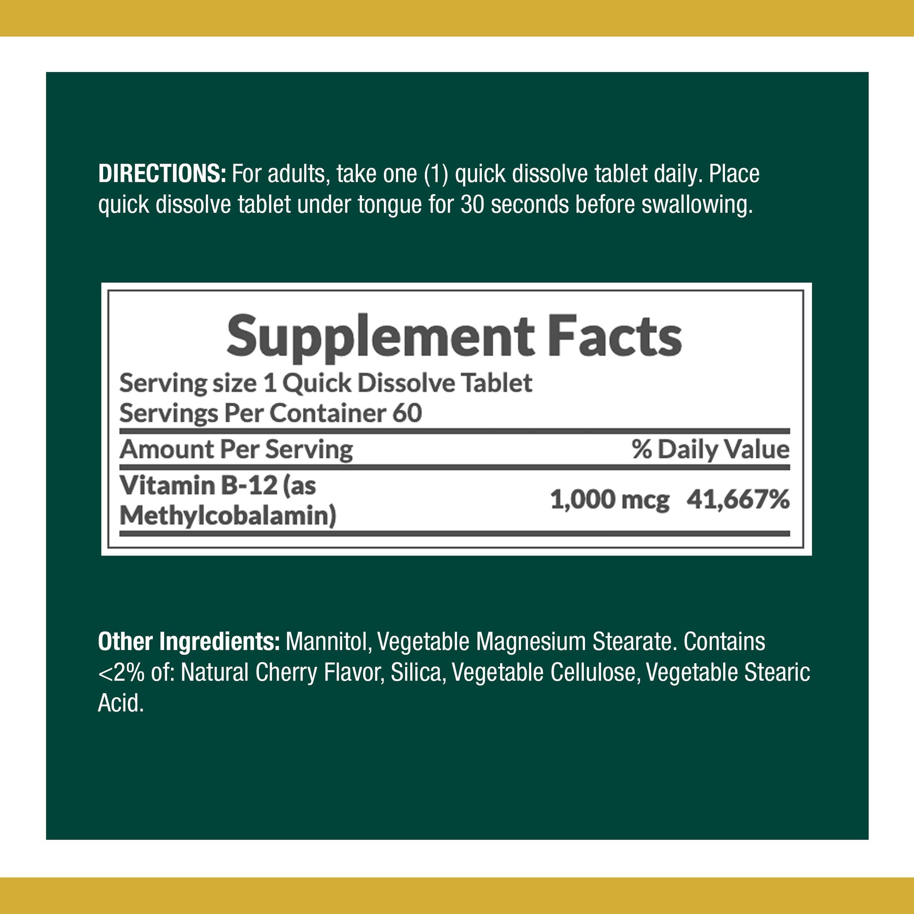 | ingredients | Nature's Bounty Vitamin B12, Supports Energy Metabolism and Nervous System Health, 1000mcg, 60 Quick Dissolve Tablets |