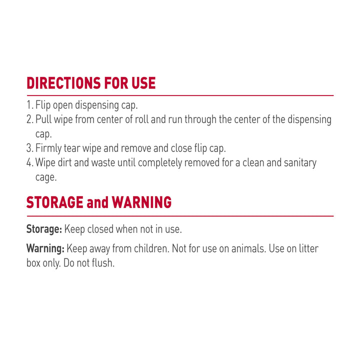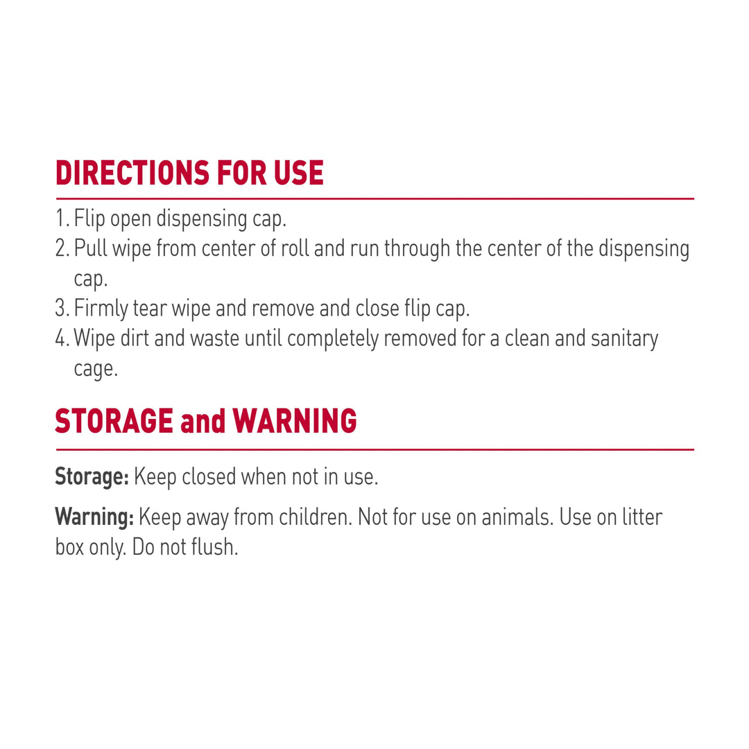 | directions | DIRECTIONS:1) Remove top of canister and flip open dispensing cap. 2) Pull wipe from center of roll and run through the center of the dispensing cap and replace lid. 3) Firmly tear wipe and remove and close flip cap. 4) Wipe dirt and waste until completely removed for a clean and sanitary litter box. |