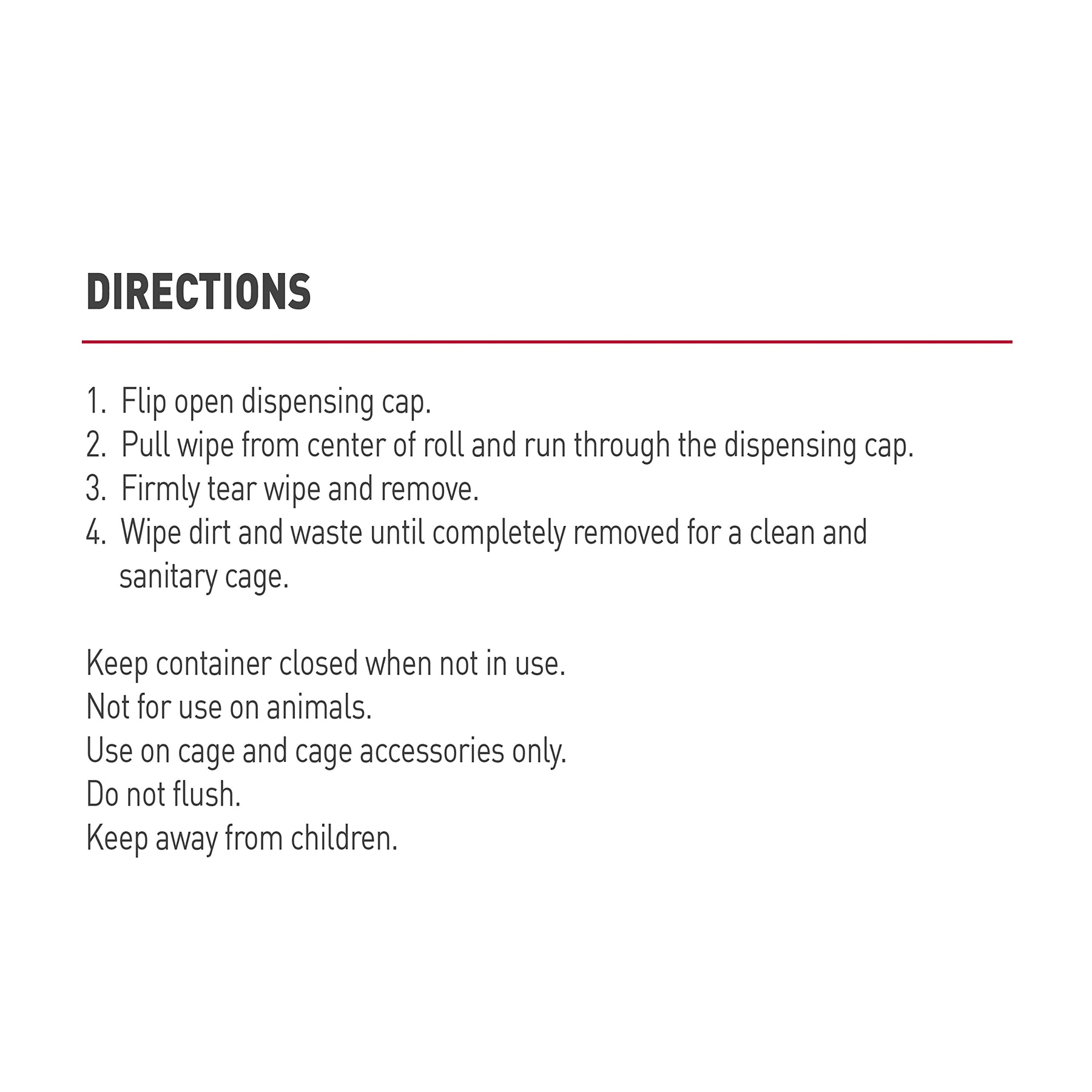 | directions | DIRECTIONS: 1)Flip open dispensing cap. 2) Pull wipe from center of roll and run through the center of the dispensing cap. 3) Firmly tear wipe and remove and close flip cap. 4) Wipe dirt and waste until completely removed for a clean and sanitary cage. |
