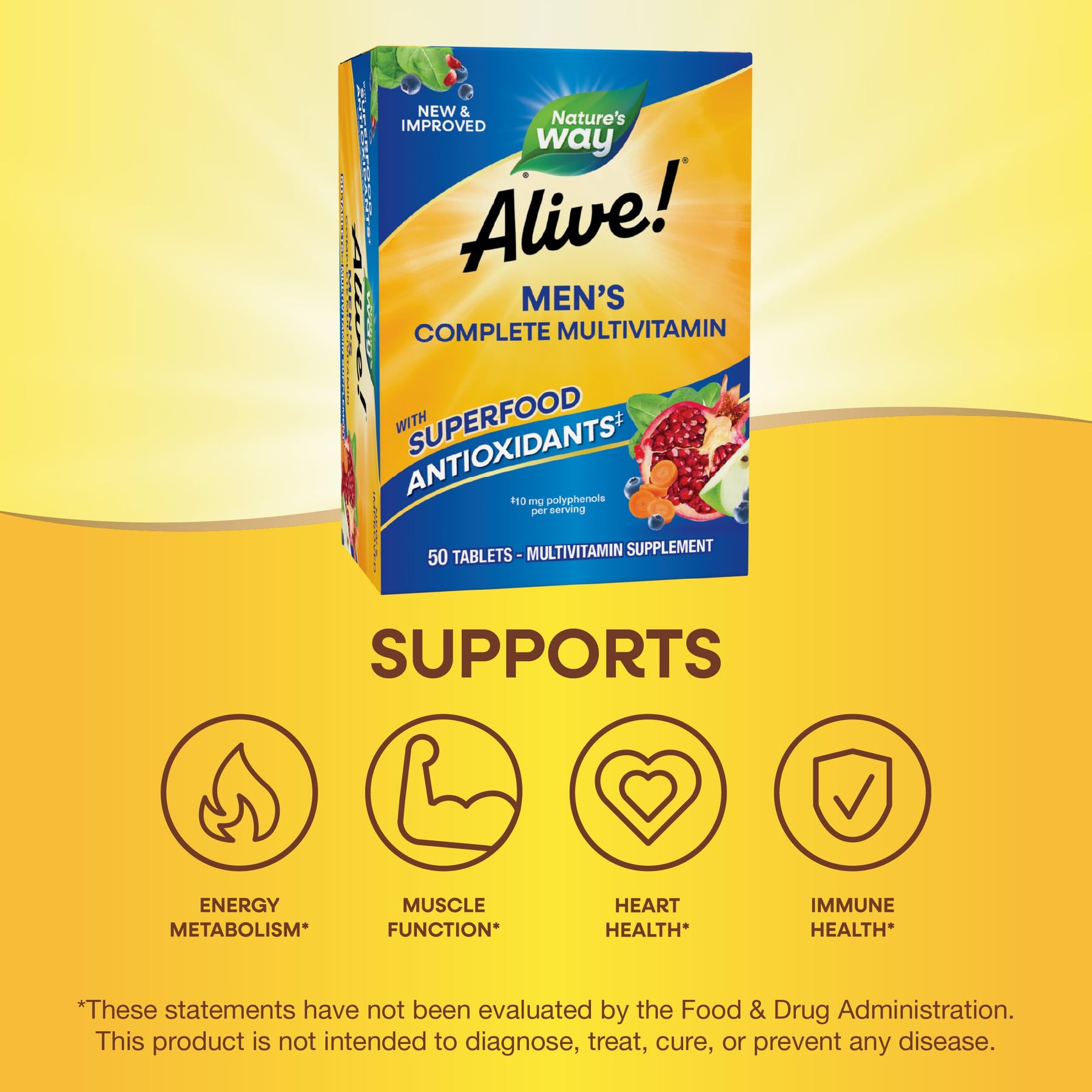 - Original Multivitamins – Nature's Way Alive! Men's Complete Multivitamin, Supports Energy Metabolism & Muscle Function*, B-Vitamins, Superfood Antioxidants**, Gluten-Free, 50 Tablets (Packaging May Vary) by Nature's Way