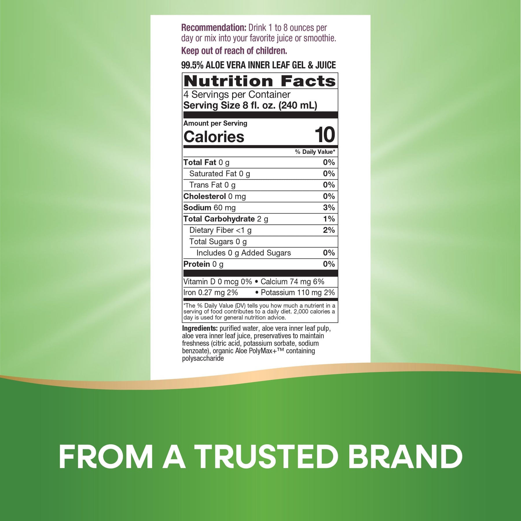 | ingredients | Vitamin D; Calcium; Iron; Potassium; Purified Water; Aloe Vera Inner Leaf Pulp; Aloe Vera Inner Leaf Juice; Preservatives To Maintain Freshness (Citric Acid; Potassium Sorbate; Sodium Benzoate); Organic Aloe Polymax+™ Containing Polysaccharide |