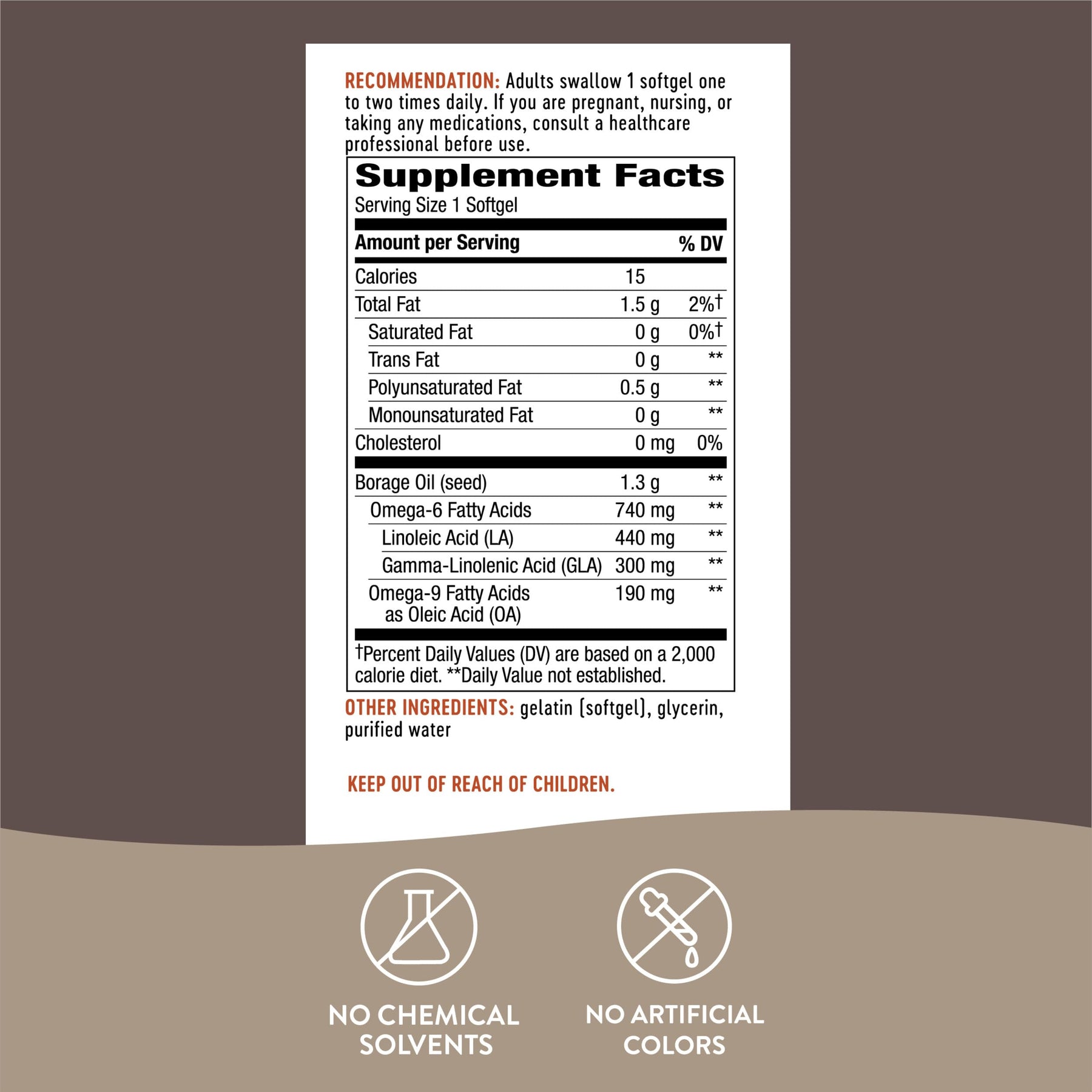 | ingredients | Borage Oil (seed); Omega-6 Fatty Acids; Linoleic Acid (LA); Gamma-Linolenic Acid (GLA); Omega-9 Fatty Acids as Oleic Acid (OA); Gelatin (Softgel); Glycerin; Purified Water |
