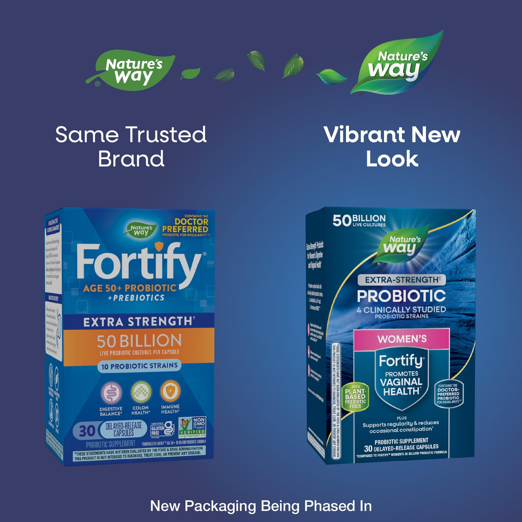 - Original Prebiotics – Nature's Way Women's Extra Strength** Fortify Probiotic, 50 Billion Live Cultures, Supports Digestive, Vaginal, & Immune Health*, Plant-Based Prebiotic Fiber, Non-GMO, 30 Capsules (Packaging May Vary) by Nature's Way