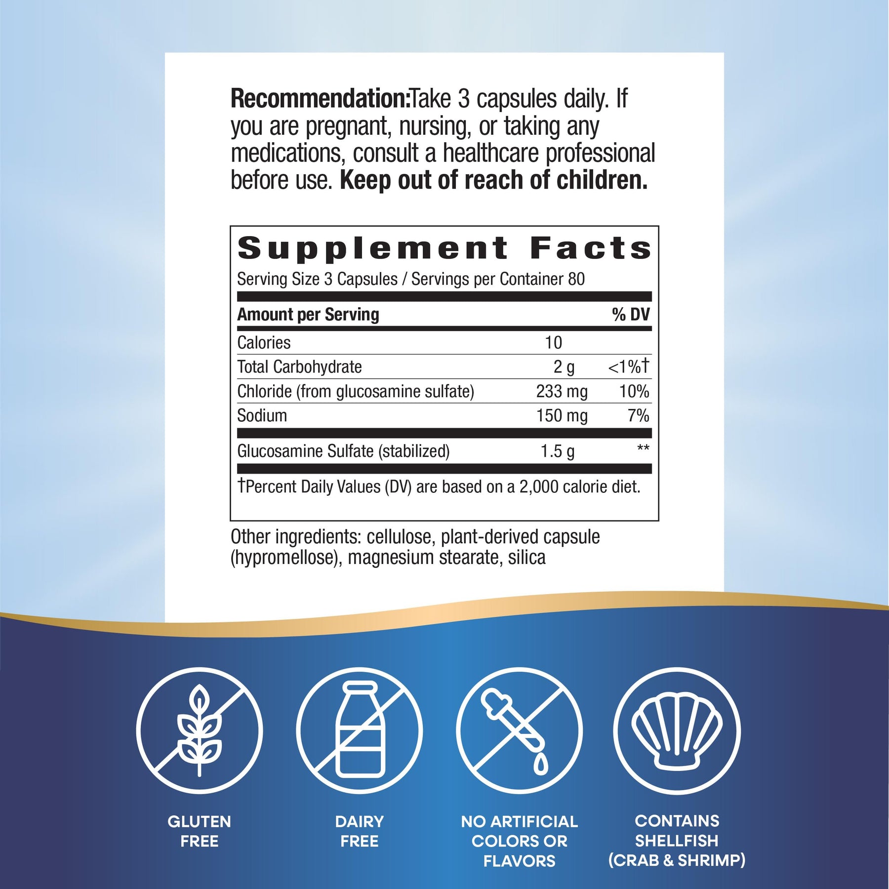 | ingredients | Chloride (from glucosamine sulfate); Glucosamine Sulfate (stabilized); Cellulose; Plant-Derived Capsule (Hypromellose); Magnesium Stearate; Silica |