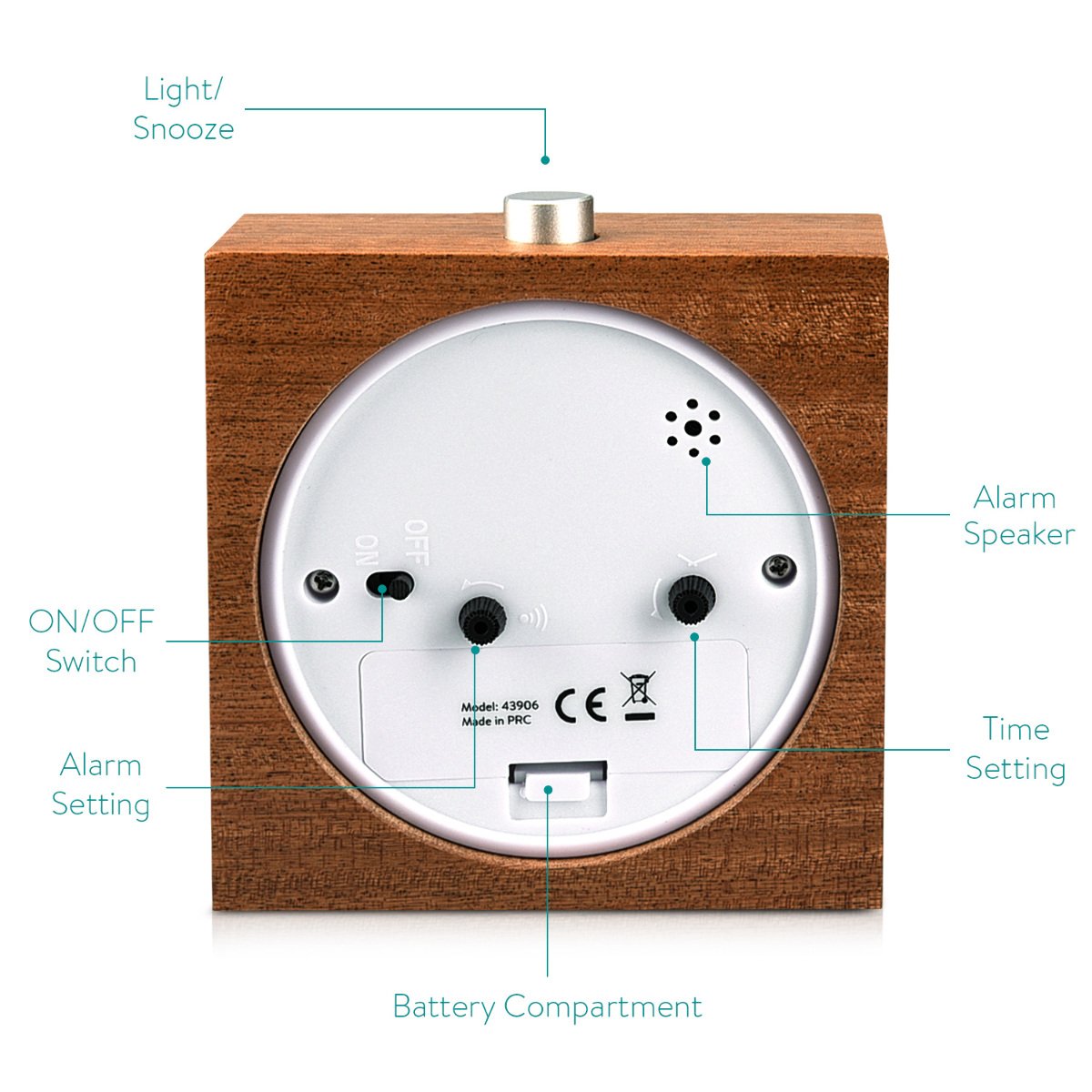 - Original Alarm Clocks – Wood Analog Alarm Clock - Square Battery-Operated Non-Ticking Clock with Snooze Button and Light - Dark Brown by Navaris