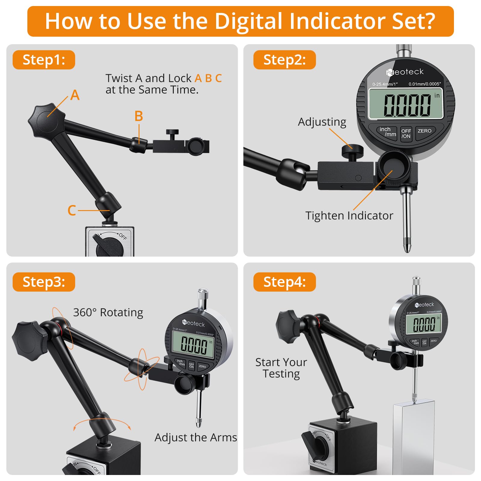 - Universal Compatible: The Set Includes 1 x Digital Dial Indicator, 1 Magnetic Base, 1 Storage Case . The Indicator Base is Compatible with Most Dial / Digital Indicators and Other Market Indicators