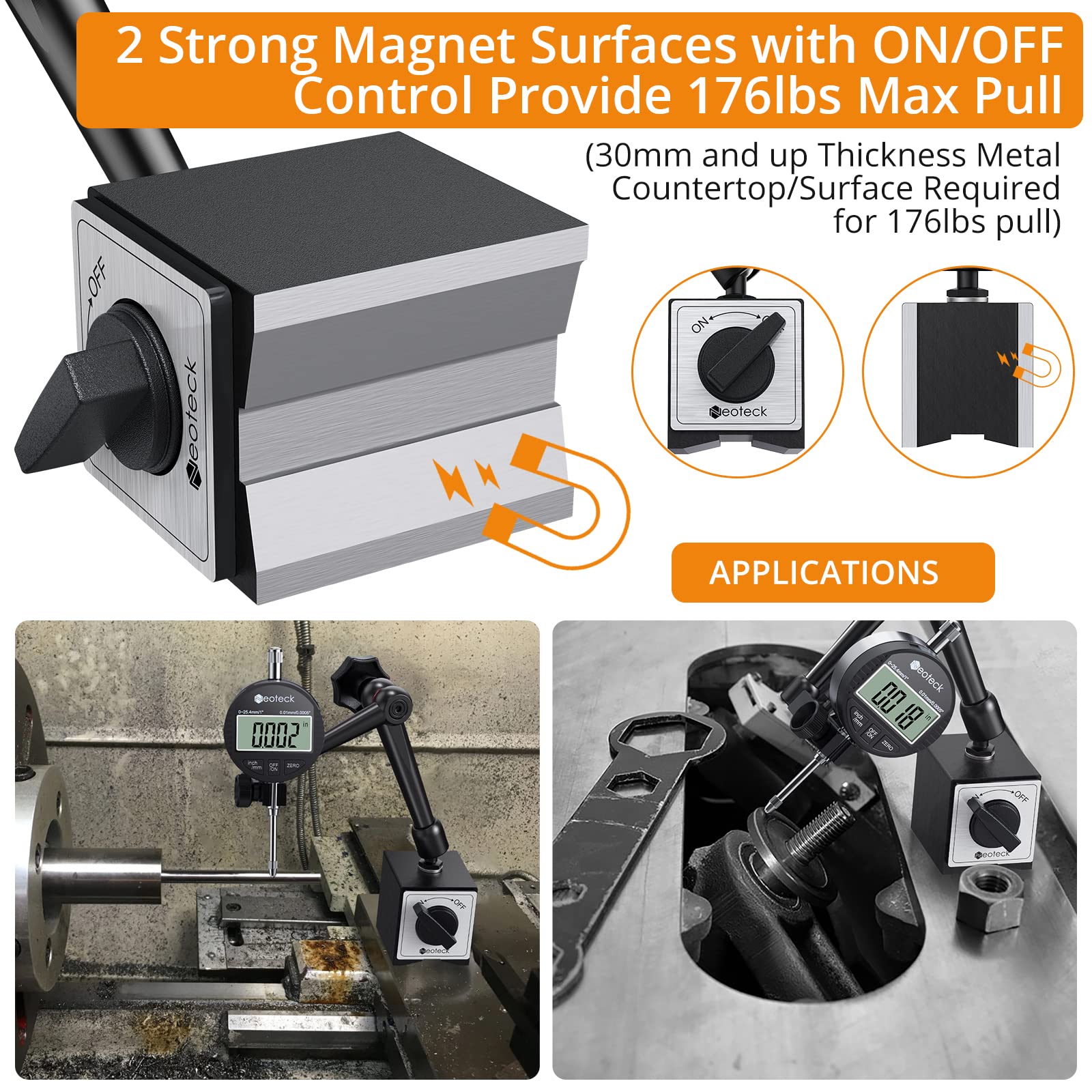 - 2 Solid Magnet Surfaces: With On/Off Control. Can Provide A Maximum Tensile Force of 176lbs/80kg (Please NOTE: 176lbs Tensile Force Requires a Metal Working Surface with a Thickness of 30mm Above)