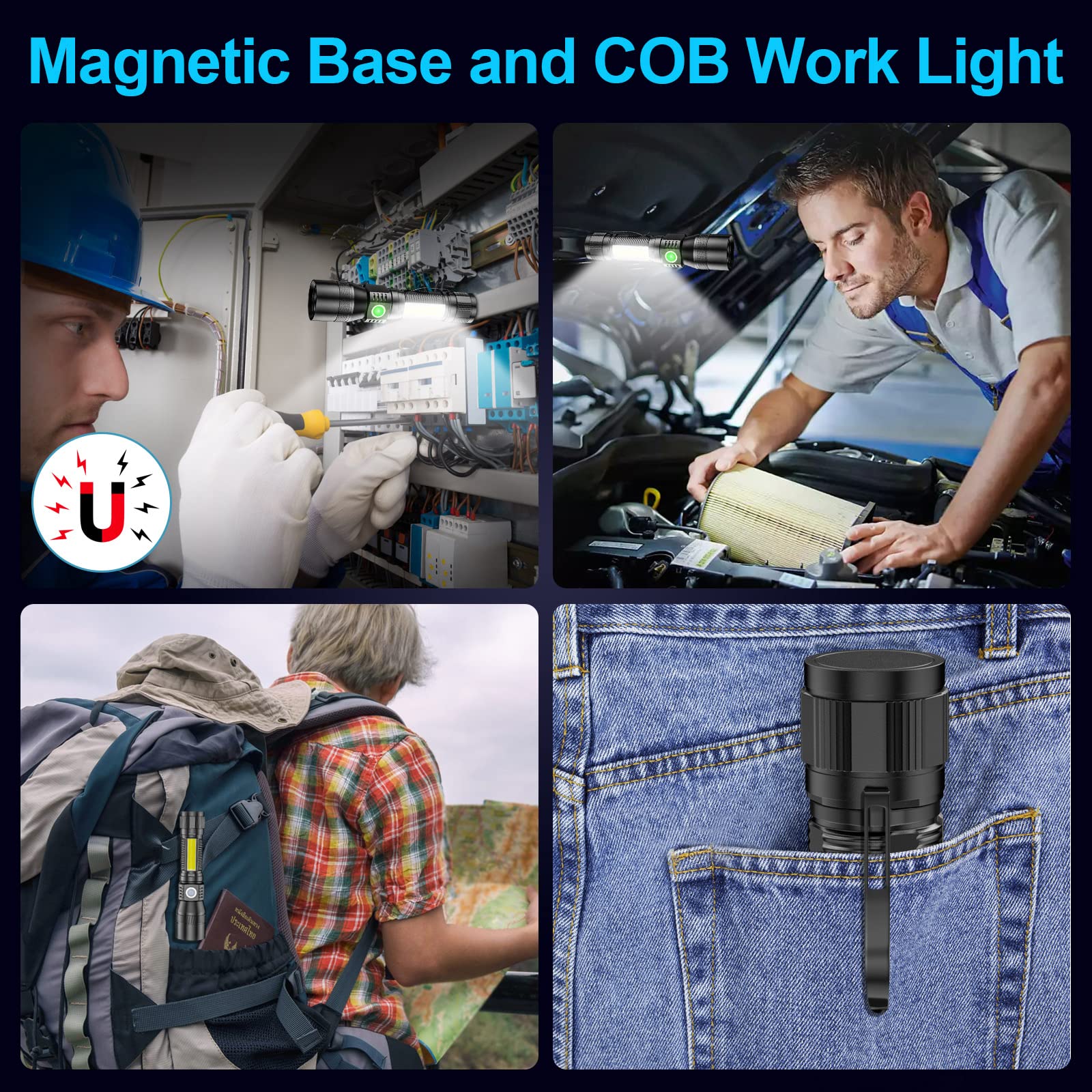 - Magnetic flashlight & COB SidelightA magnet in flashlight tail, When you do car repair/ home maintenance, the led magnetic light can stick to any iron surface, So It comes to your led work light, and can make your hand free. So that you can focus on your mechanic tools. The red light provides a 650nm emergency light. That makes you more visible during the survival environment.