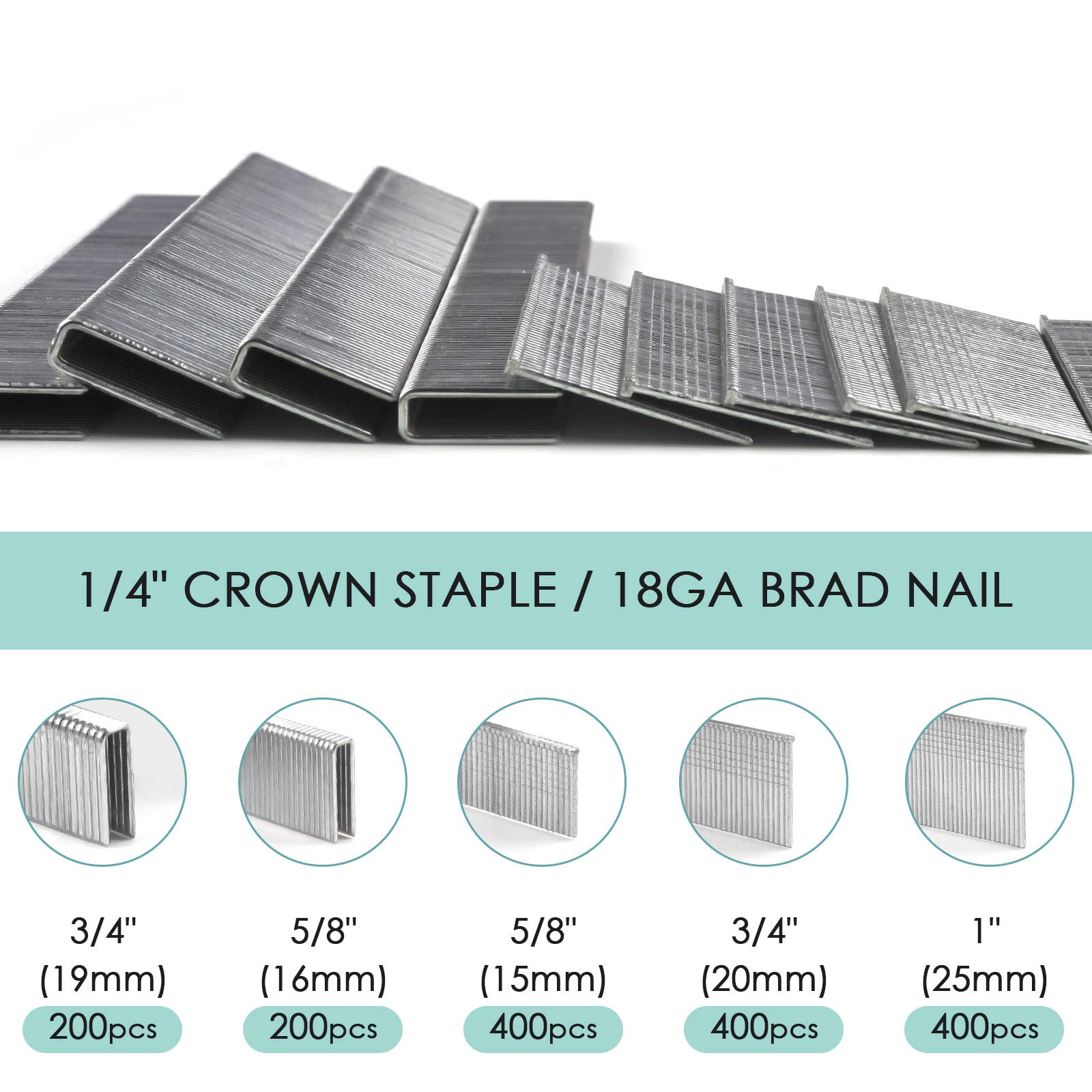 - [What You Get ] --- 1600-count heavy duty fasteners in 5 different sizes. Includes: 1/4 Crown staple 3/4 & 5/8 200pcs each, and 18GA brad nail 5/8”, 3/4” & 1” 400pcs each, which will meet most of your fastening needs.