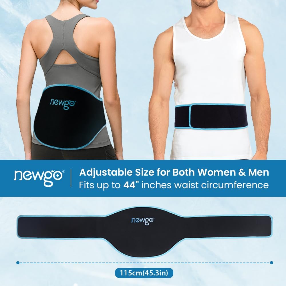 - Lower Back Pain Relief - NEWGO ice pack for back is specially designed to contour around the back shape and covers entire back and tail bone area. The back ice pack wrap provides the maximum pain relief from lower and upper back pain, soreness, sciatica nerve pain, spinal injuries, herniated disc, pulled muscle.