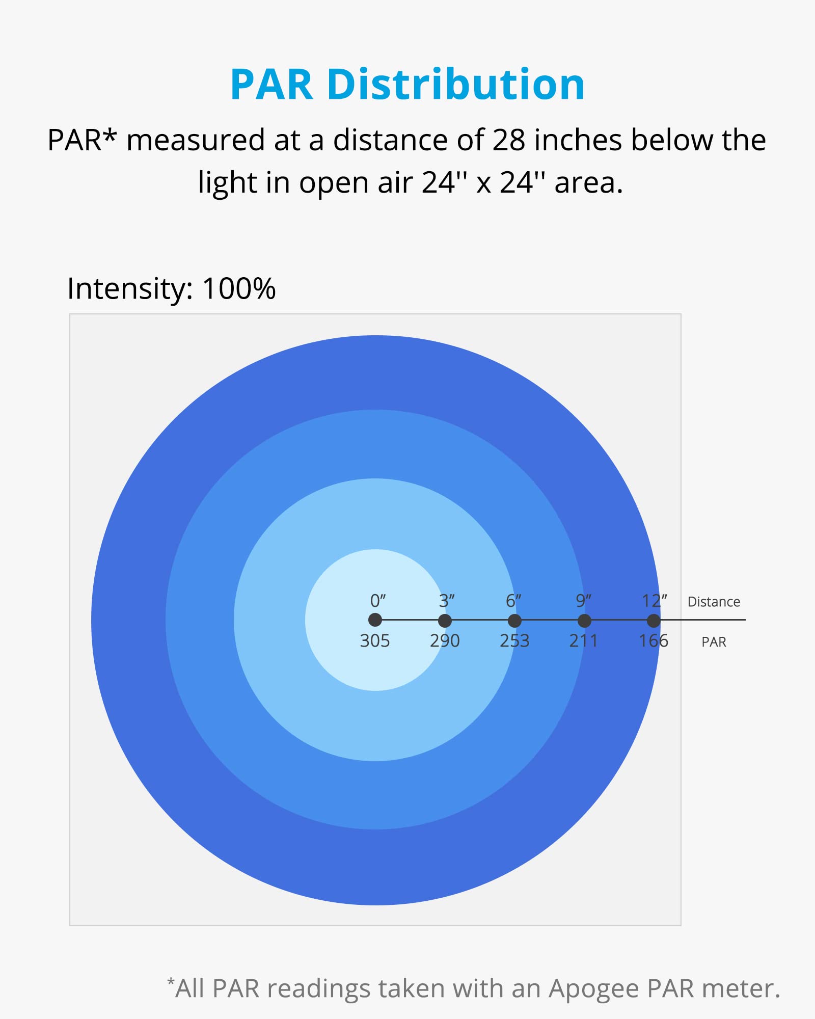 - With a maximum spread of 30 x 30, the light has an average PAR of 305µMol at a depth of 28 inches, perfect for medium to large reef tanks