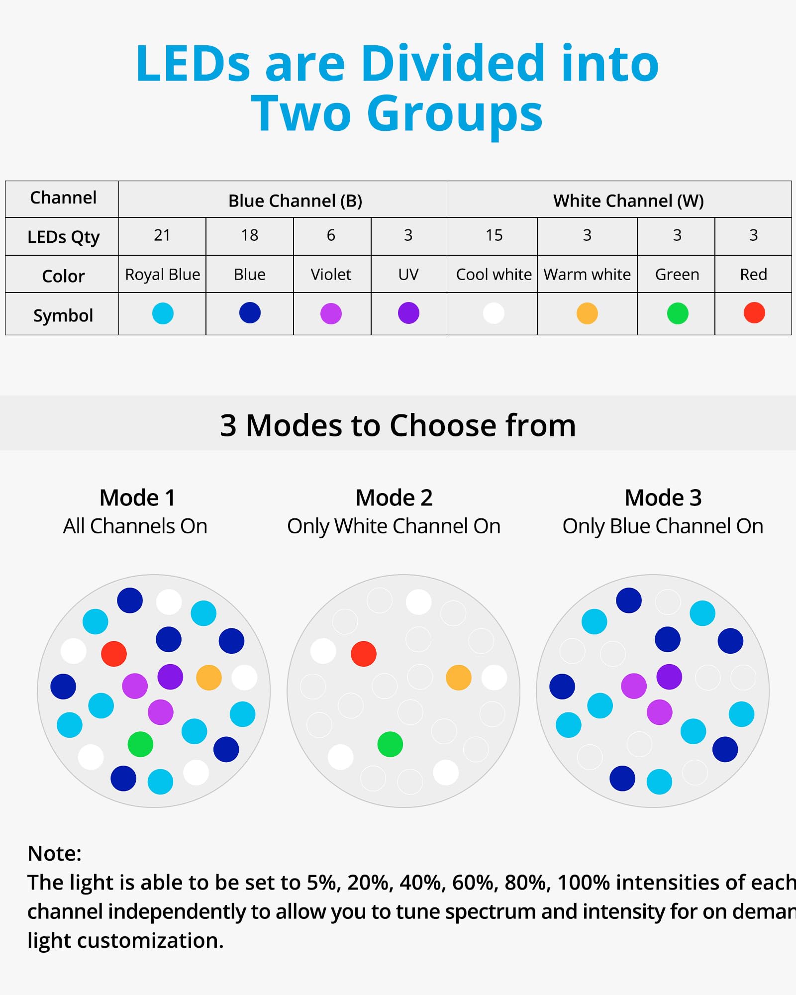 - Full color spectrum (popular blue spectrum, red, green and Violet+UV) can promote optimal coral growth and enhance dramatic coloration, while creating a gentle shimmer throughout the aquarium