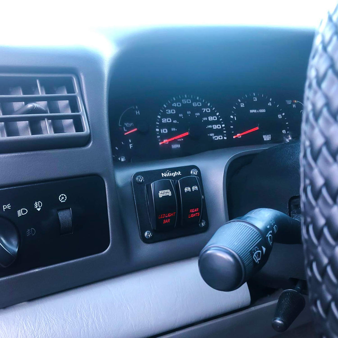 - Original Toggle – 2 Gang Rocker Switch Panel LED Light Bar Switch Rear Lights Switch 12 24V DC Red Switches 5Pin ON Off Pre Wired Toggle Switch Panel for Cars ATVs UTVs,2 Years Warranty by Nilight
