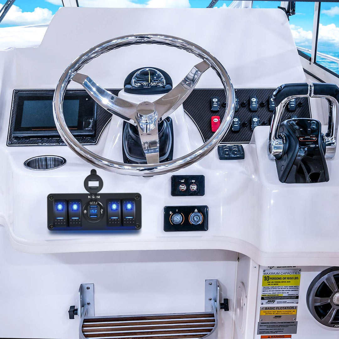 - Multi-Function designed: This Switch Panel is integrated with 4 Rocker switches and QC3.0 dual USB charger with Voltmeter. Suitable for most 12V-24V DC cars, UTVs/ATVs, trucks, trailers, RVs, caravans, buses, marine boats, yachts etc..Material:Plastic,Metal