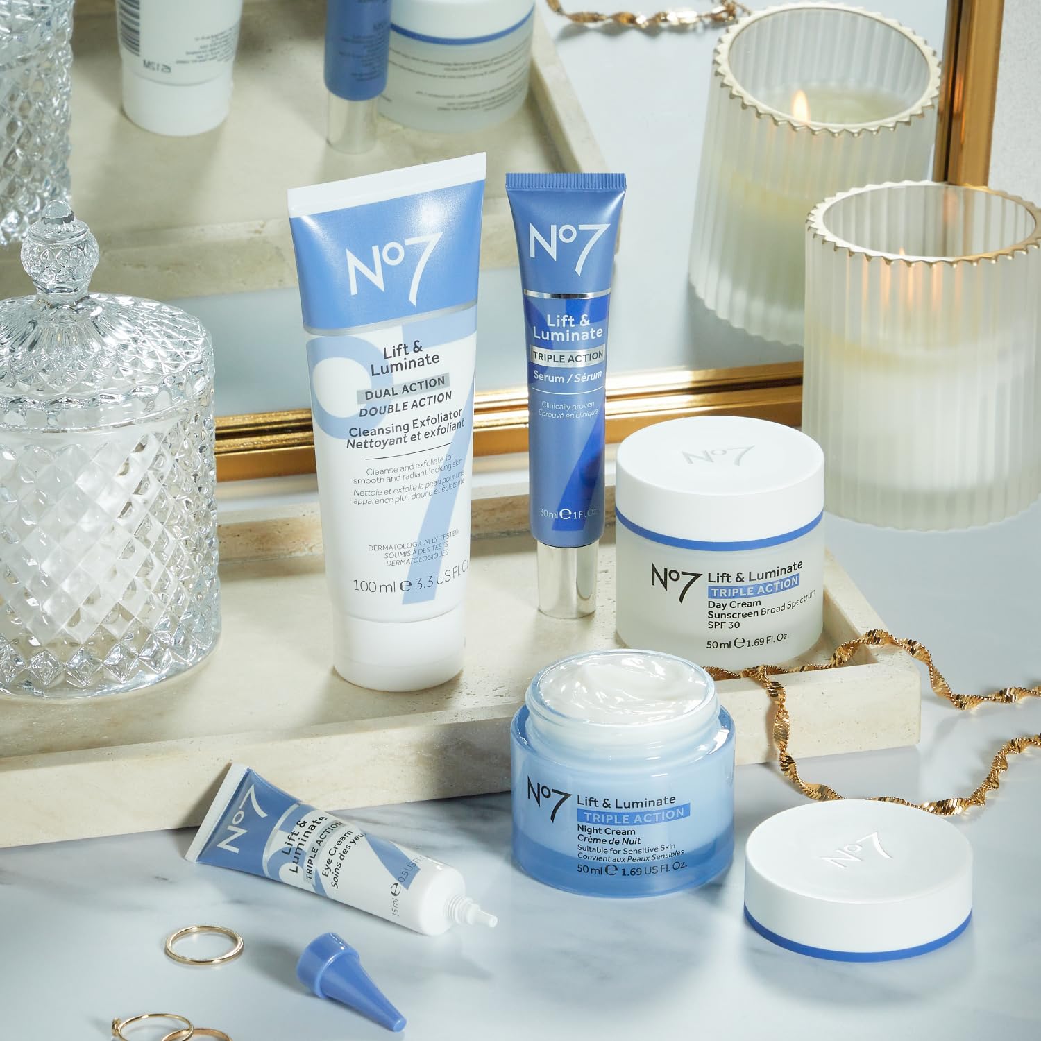 - Effective Formulation - The gentle exfoliating particles in this facial wash help accelerate surface skin cell turnover while excess oil is removed, leaving skin feeling cleansed, renewed, and bright. An ideal first step to your No7 Lift & Luminate skincare routine, allowing your serum & moisturizer to work more effectively.