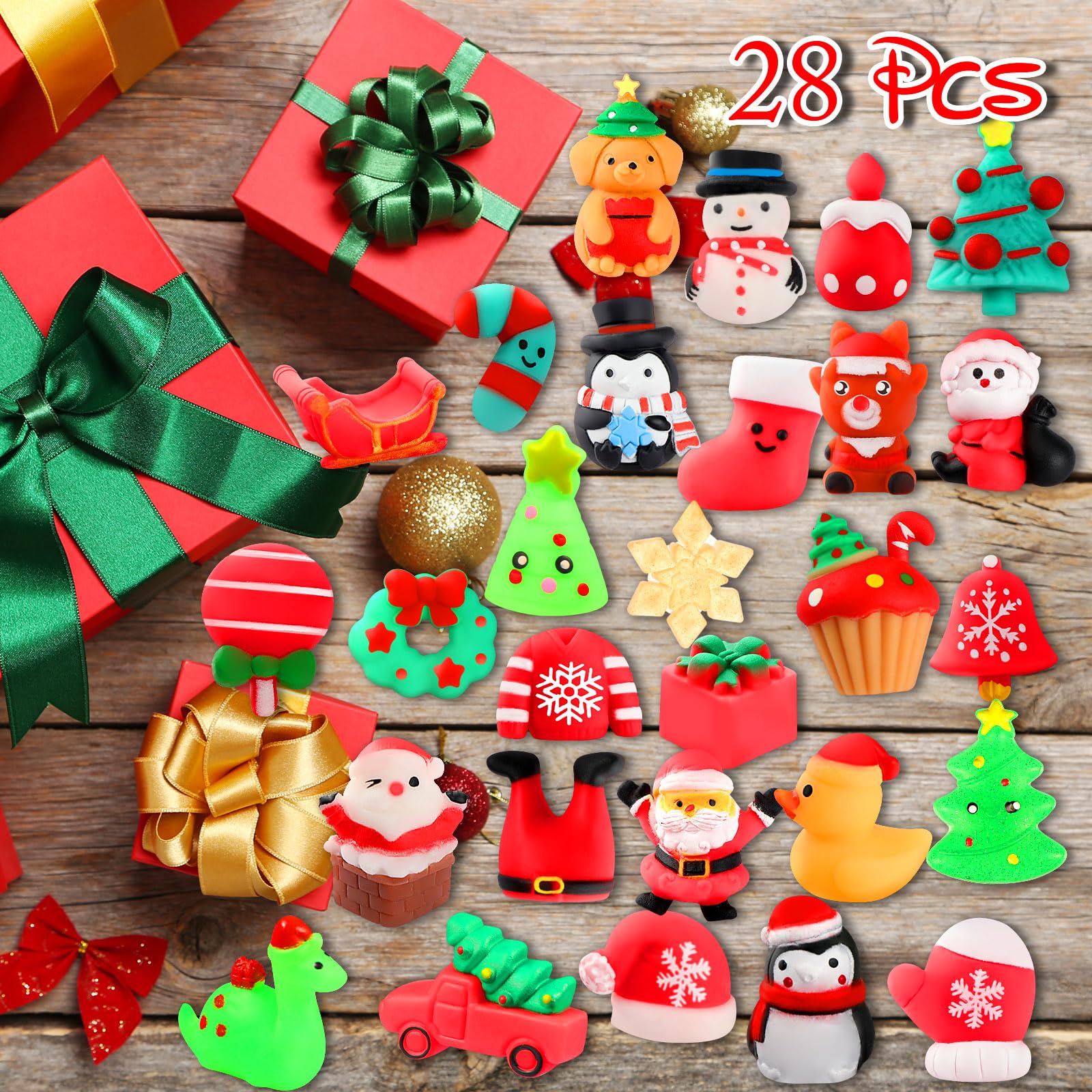 - PACK OF 28: 28 individually wrapped Christmas mochi squishies.