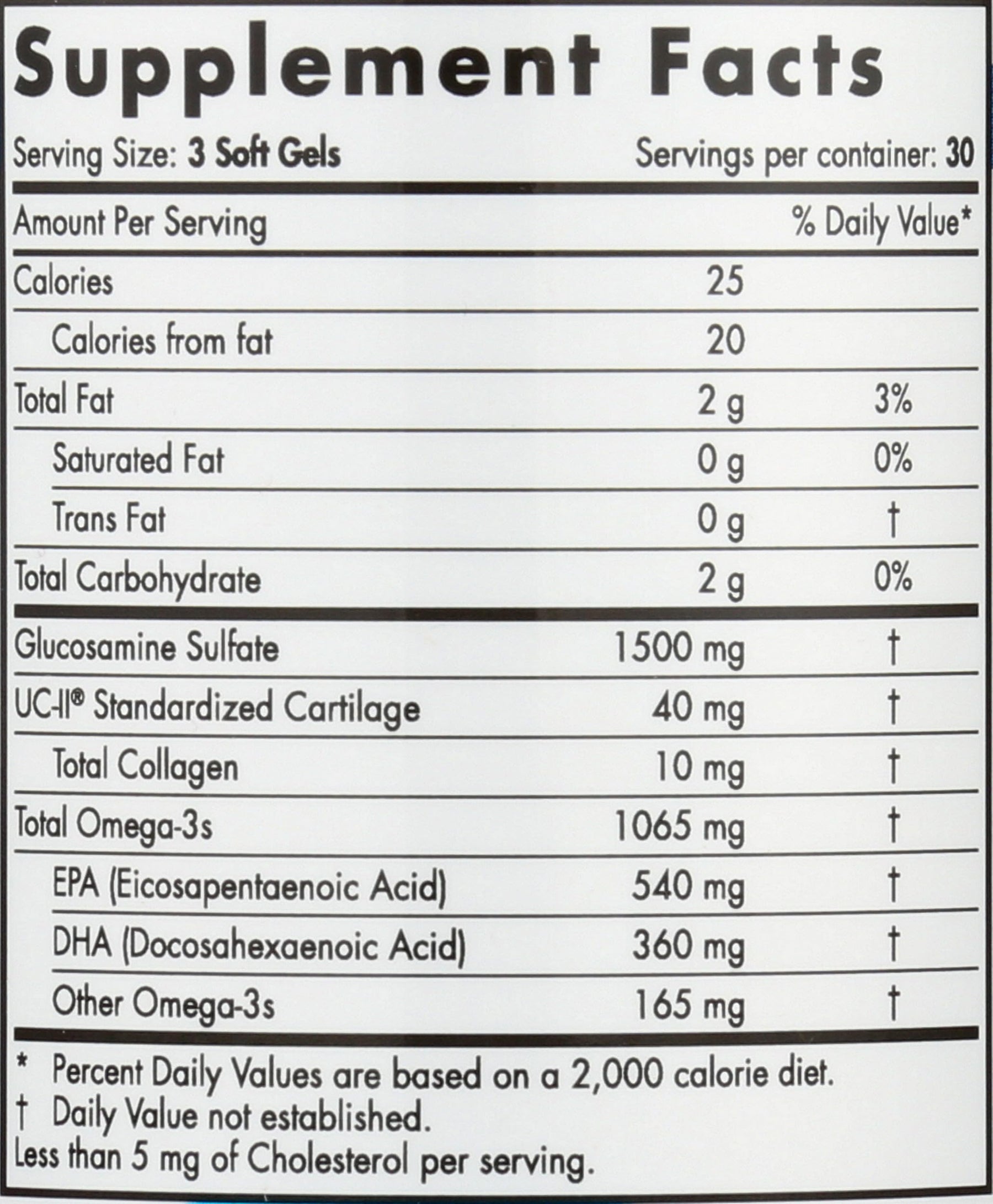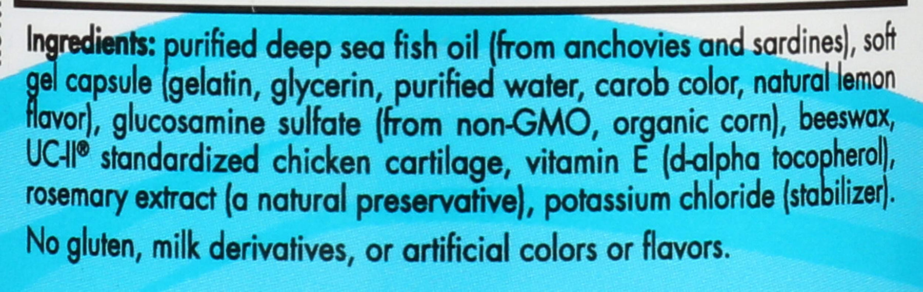 | ingredients | Purified deep sea fish oil (from anchovies and sardines), soft gel capsule (gelatin, glycerin, purified water, carob color, natural lemon flavor), glucosamine sulfate, beeswax, UC-II(R) standardized chicken cartilage, d-alpha tocopherol (antioxidant), rosemary extract (a natural preservative), potassium chloride (stabilizer). |