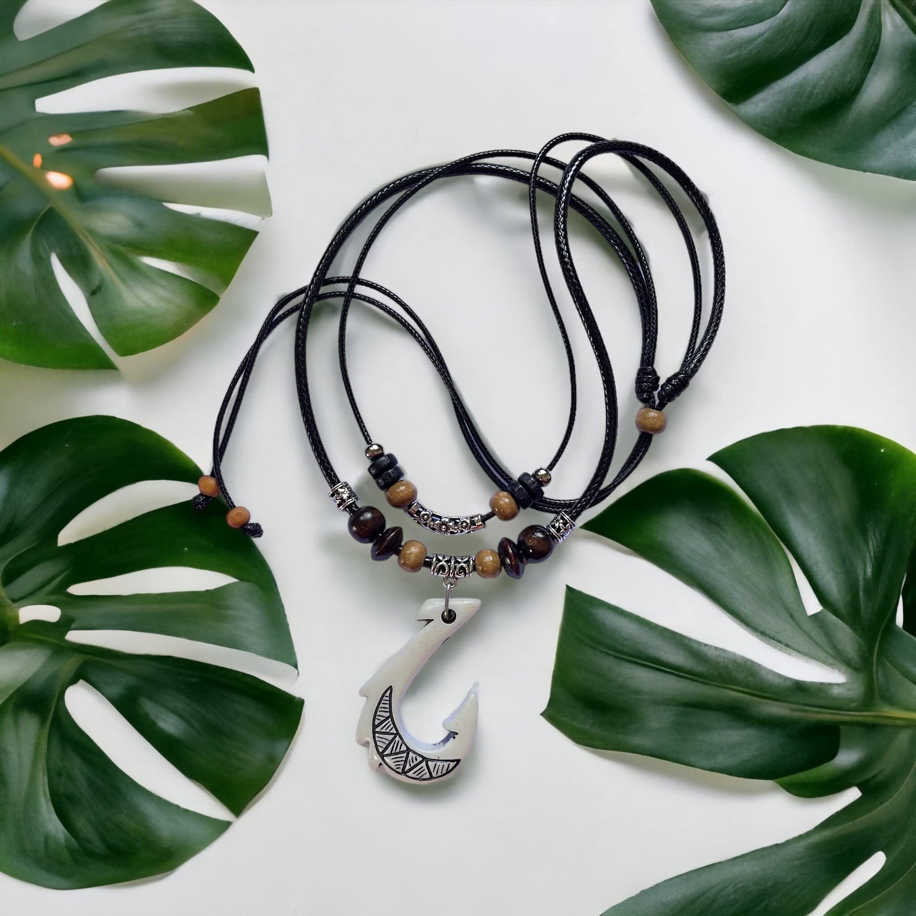 The necklace becomes a sacred link between people, spanning time and distance. Who wears the 'Lucky' Hawaiian Bone Fish Hook Necklace Hawaiian tradition says that fish hooks provide good luck and safe journey when going fishing and traveling.