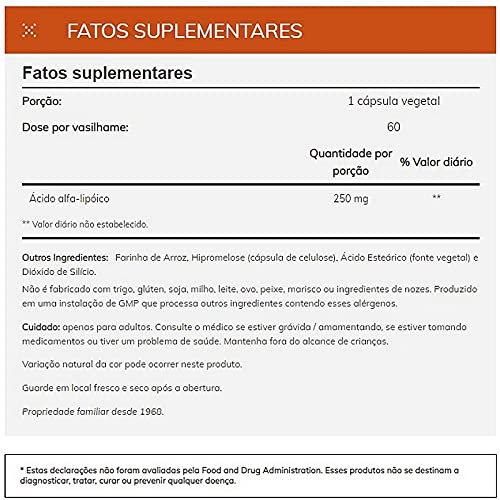 | ingredients | Supplement Facts Serving Size: 1 Veg Capsule Servings Per Container: 120 Description Amount per Serving % Daily Value * Percent Daily Values are based on 2,000 calorie diet.† Daily Value not established. Alpha Lipoic Acid 250 mg† Other Ingredients: Rice Flour, Vegetable Polysa haride (capsule), Magnesium Stearate (vegetable source) and Silica. Not manufactured with wheat, gluten, soy, milk, egg, fish, shellfish or tree nut ingredients. Produced in a GMP facility that processes other ingredients containing these allergens. Caution: For adults only. Consult physician if pregnant/nursing, taking medication, or have a medical condition. Keep out of reach of children. Do Not Eat Freshness Packets. Keep in Bottle. Store in a cool, dry place after opening. Please Recycle. Natural color variation may our in this product. Family owned since 1968. *These statements have not been evaluated by the Food and Drug Administration. This product is not intended to diagnose, treat, cure or prevent any disease. |