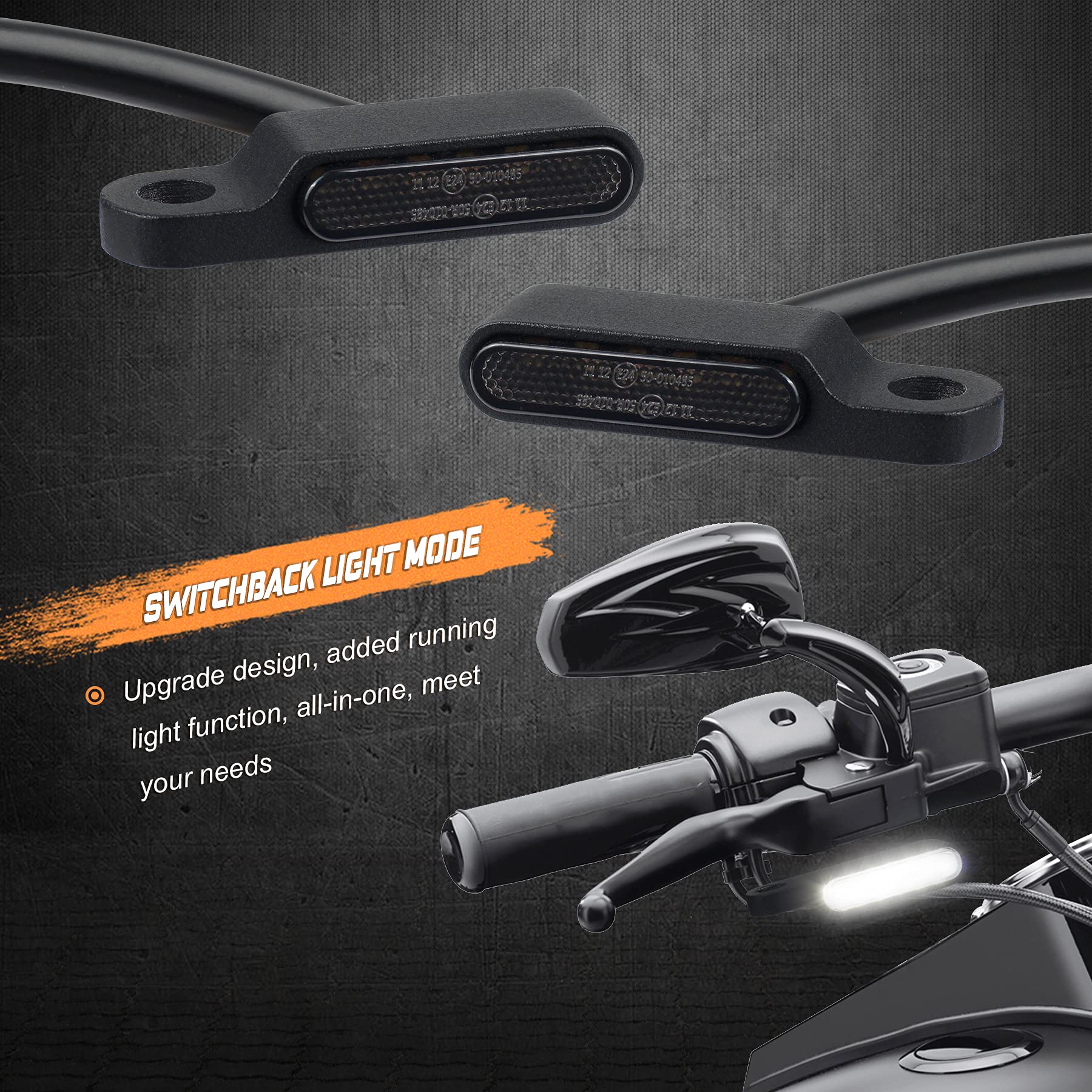 - Added Running Light Function - Upgrade design, switchback mode, all-in-one, meet your needs. Amber light for front turn signal, white light for running light, stylish, nice and attractive, add features to your motorcycles, enhance your motorcycle appearance. Can be mounted under the handlebar mirror bolts. Easy wiring, black to ground, yellow to turn signals, white to driving light.