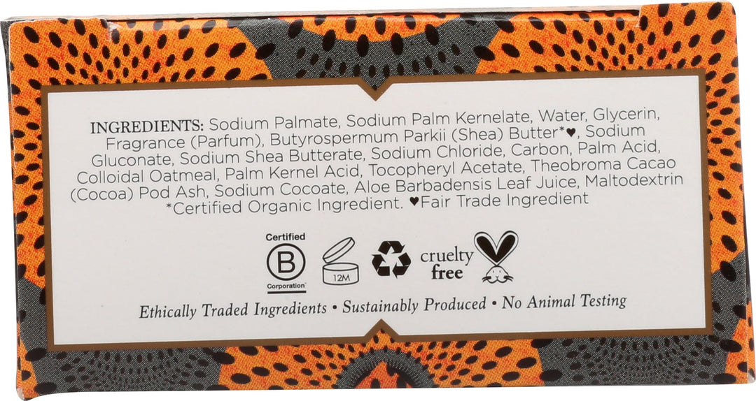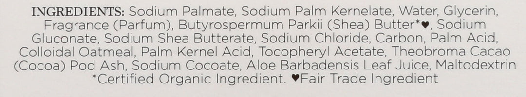 | ingredients | Sodium Palmate, Sodium Palm Kernelate, Water, Glycerin, Fragrance (Parfum), Butyrospermum Parkii (Shea) Butter, Sodium Gluconate, Sodium Shea Butterate, Sodium Chloride, Carbon, Colloidal Oatmeal, Palm Acid, Tocopheryl Acetate, Theobroma Cacao (Cocoa) Pod Ash, Sodium Cocoate, Aloe Barbadensis Leaf Juice, Maltodextrin |