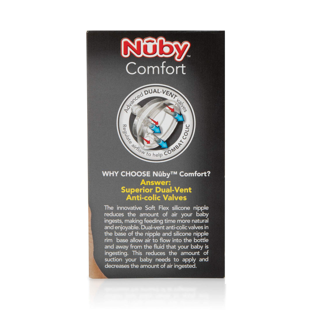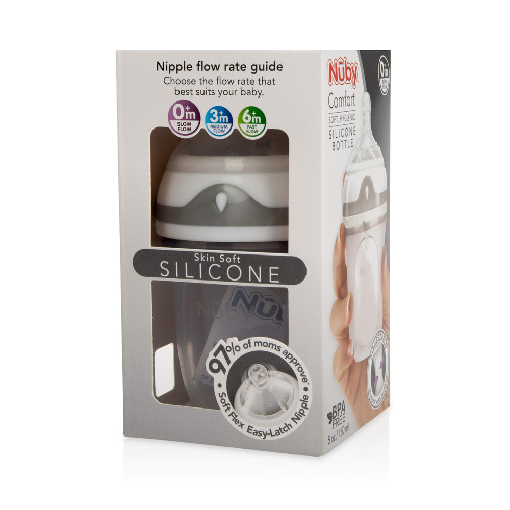 - Nuby’s Comfort Silicone Bottle base and Soft Flex nipple are made of 100% silicone. The bottle’s hood, neck ring, and screw cap are made of polypropylene. Nuby uses safe and durable materials with your child’s health in mind.