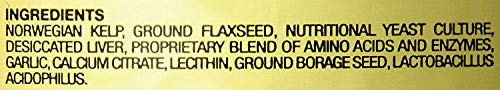 | ingredients | Desiccated liver, Norwegian Kelp, micropulverized bee pollen, yeast culture, Flaxseed and Ground Borage seed, Lecithin, Garlic and Lactobacilla Acidophilus. |