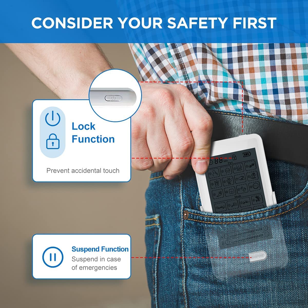 - Multiple options for pain relief & Pause function: 24 pre-programmed modes EMS TENS unit reduce pain and muscle spasms. Small electrical impulses delivered through electrodes alleviate arthritis, period pain, knee pain, neck pain, back pain, sports injuries. A good non-invasive, non-drug option for pain relief. Moreover, when need to pause it because of temporary things, just press the SUSPEND button to pause.