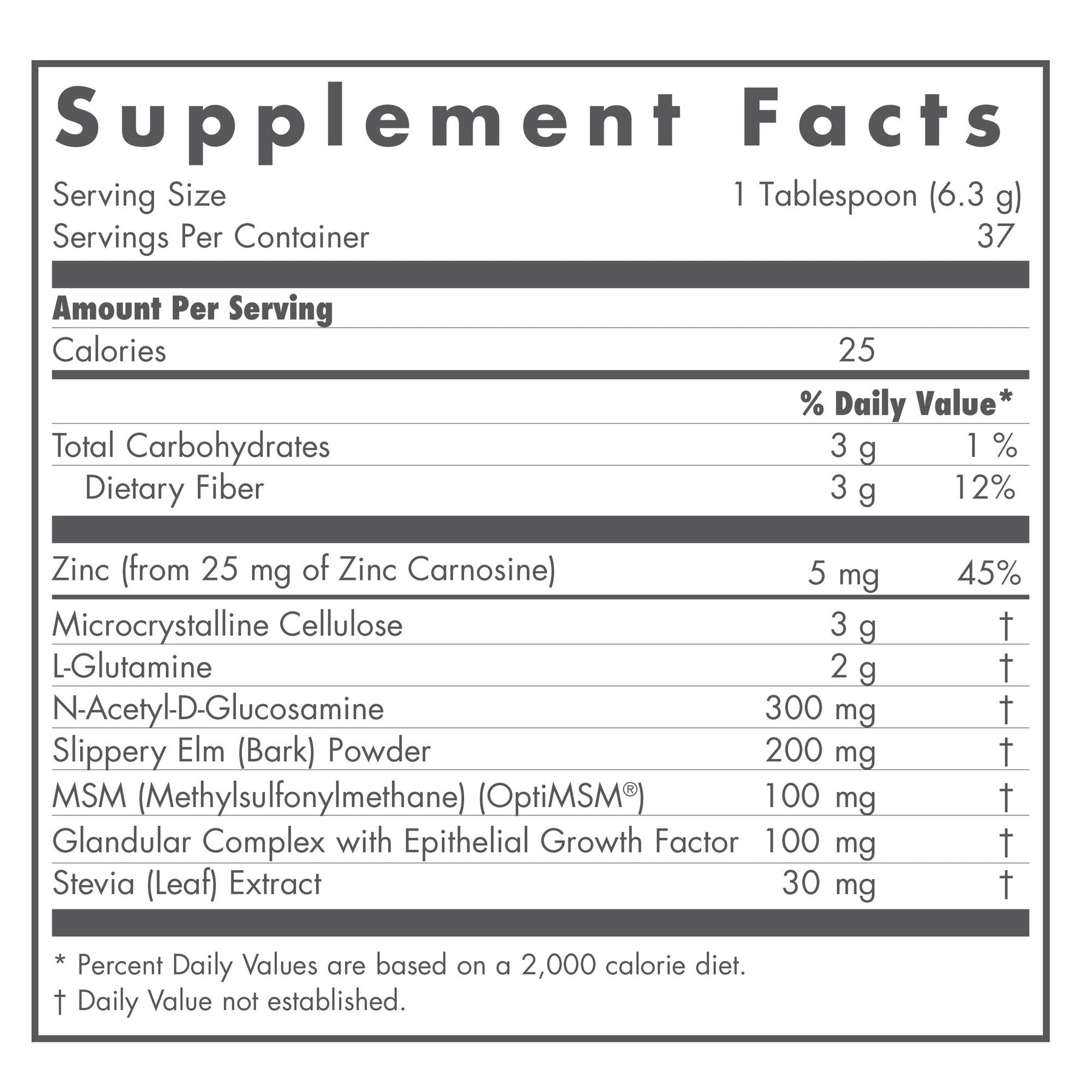 | ingredients | Calories (15), Total Carbohydrate (3.7 g), Dietary Fiber (3.7 g), Cellulose (3.7 g), LGlutamine (3.7 g), NAcetylDGlucosamine (185 mg), Slippery Elm (110 mg), MSM (160 mg), Stevia (30 mg), Glandular Complex With Epithelial Growth Factor (70 mg) |