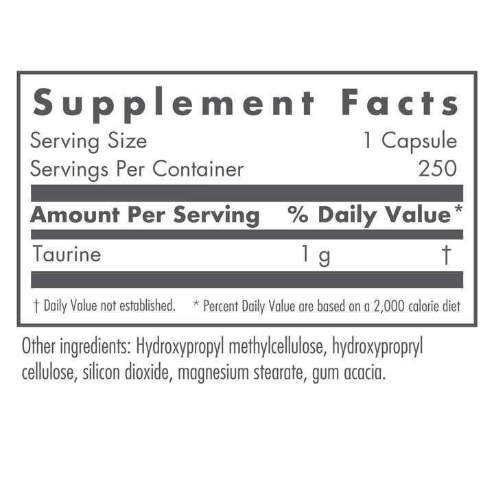| ingredients | Taurine Amount Per Serving : 1000 mg % Daily Value*:†,Other Ingredients Hydroxypropyl methylcellulose, microcrystalline cellulose, silicon dioxide, magnesium stearate. |