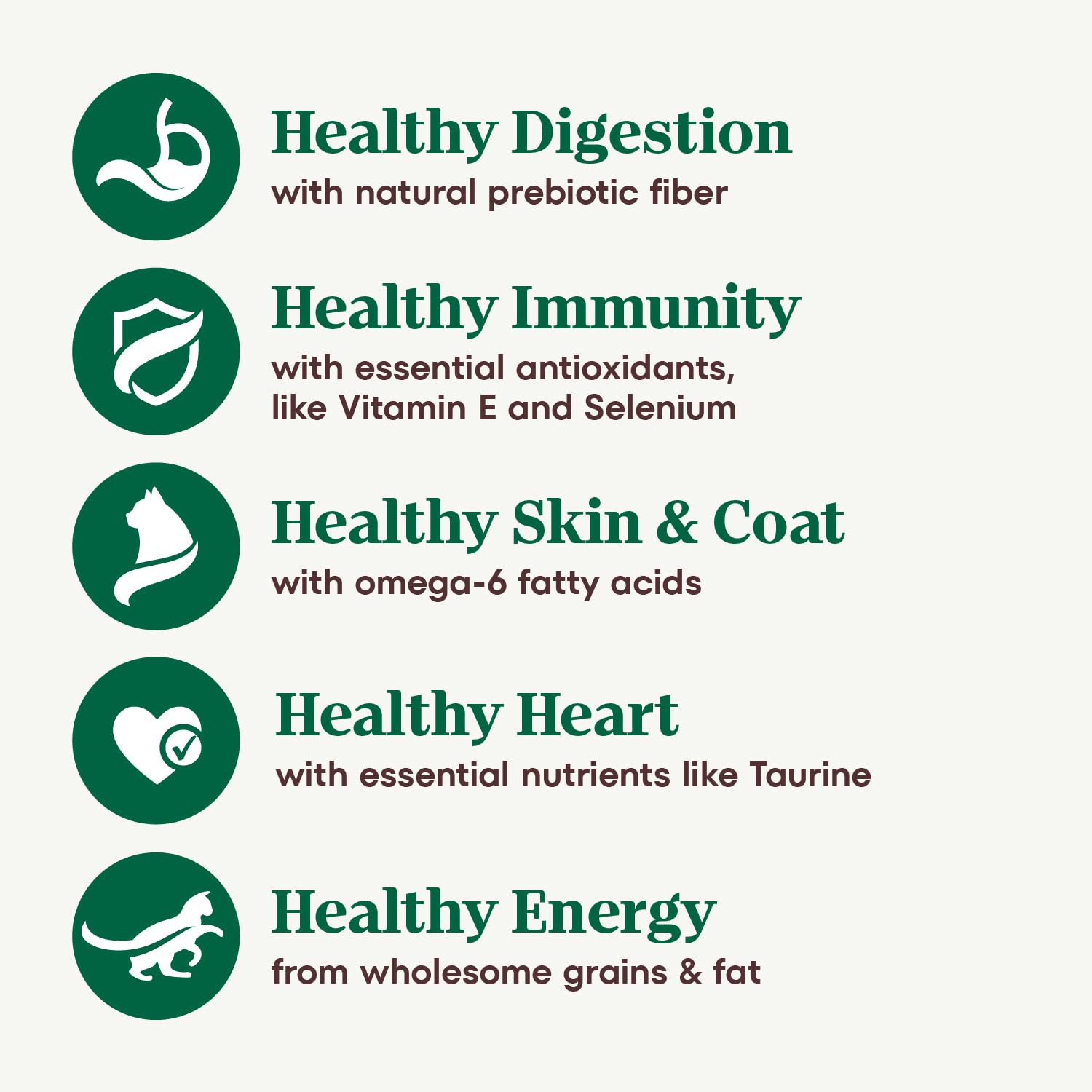 | ingredients | Chicken, Chicken Meal, Pea Protein, Whole Brown Rice, Brewers Rice, Chicken Fat (preserved with Mixed Tocopherols), Dehydrated Alfalfa Meal, Potato Protein, Whole Grain Oatmeal, Flaxseed, Dried Plain Beet Pulp, Natural Flavor, Soybean Oil (preserved with Mixed Tocopherols), Potassium Chloride, Fish Oil (preserved with Mixed Tocopherols), Choline Chloride, Salt, DL-Methionine, Mixed Tocopherols and Citric Acid (preservatives), Taurine, Zinc Sulfate, Vitamin E Supplement, L-Ascorbyl-2-Polyphosphate (source of Vitamin C), Iron Amino Acid Chelate, Yucca Schidigera Extract, Vitamin B12 Supplement, Copper Amino Acid Chelate, Niacin Supplement, Manganese Amino Acid Chelate, Biotin, Riboflavin Supplement (Vitamin B2), D-Calcium Pantothenate, Thiamine Mononitrate (Vitamin B1), Vitamin A Supplement, Pyridoxine Hydrochloride (Vitamin B6), Sodium Selenite, Vitamin D3 Supplement, Potassium Iodide, Folic Acid, Rosemary Extract |