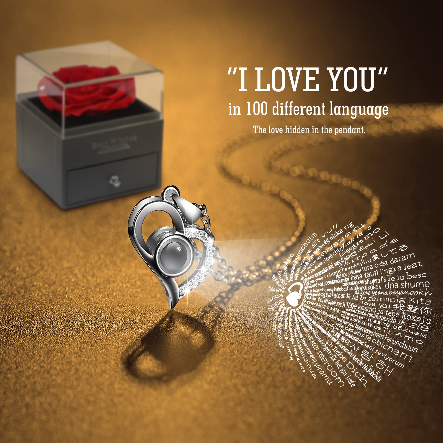 - 100% Handmade Real Rose Necklace 5-in-1 SetThe package includes 1 * 'I love you' heart pendant necklace + 1* jewelry gift box+ 1 Gift Bag + 1 Greeting Card. The pendant is about 1.5 x 1 inch, easy to adjust and suitable for almost every woman. The fresh and beautiful eternal rose represents love forever, it helps you to express your love. A perfect gift for mom and wife.