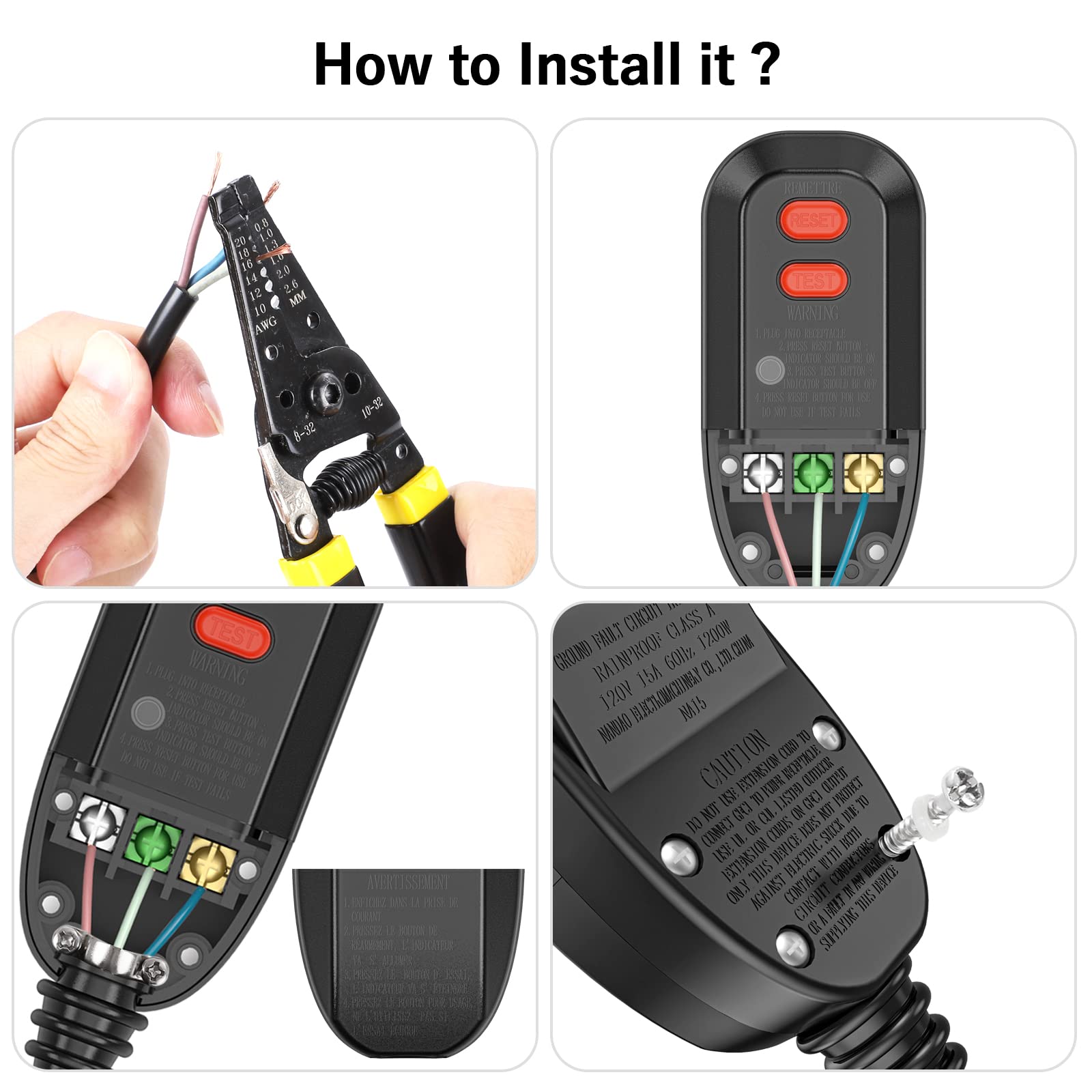 - Easy to InstallGround fault circuit interrupter with surge protection. Just respectively connect 3 pcs of wires to joint screws marked BLK (live wire), GRN (earth wire), and WHT (null wire). Then screw down and close the cover.