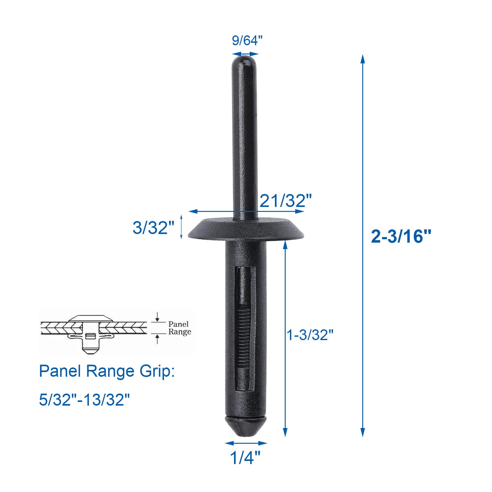- Hole Diameter: 1/4, Panel Range Grip: 5/32-13/32, Overall Length: 2-3/16, Shaft Length: 1-3/32, Flange Height: 3/32, Flange Width: 21/32