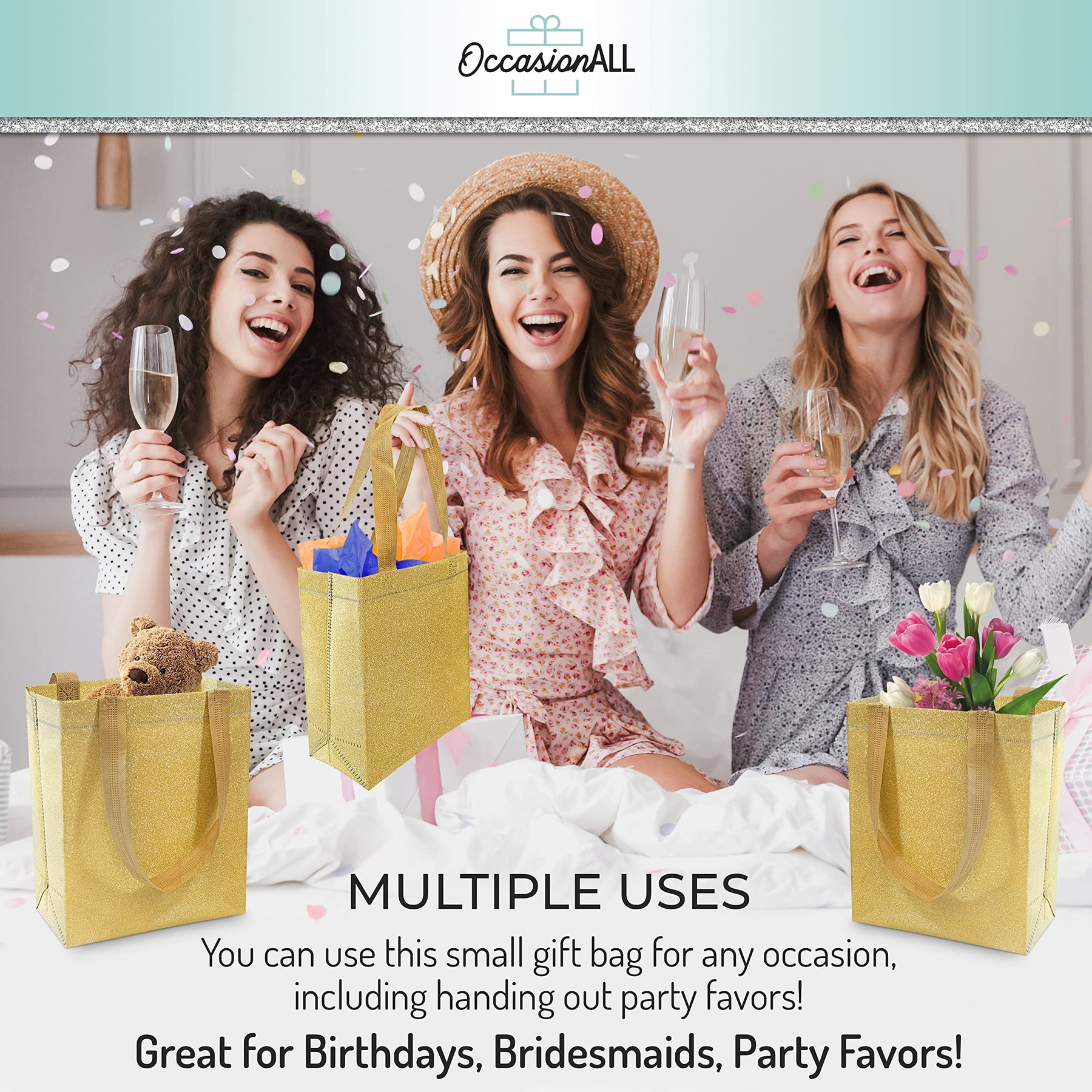 - SMALL GIFT BAG – Each of OccasionAll’s reusable glitter totes measures 8” wide x 4” deep x 10” tall, and are made from high quality, eco-friendly and reusable PP non-woven materials that won’t emit harsh or unsettling odors. Strong sewn handles make carrying smaller size gifts or items easy