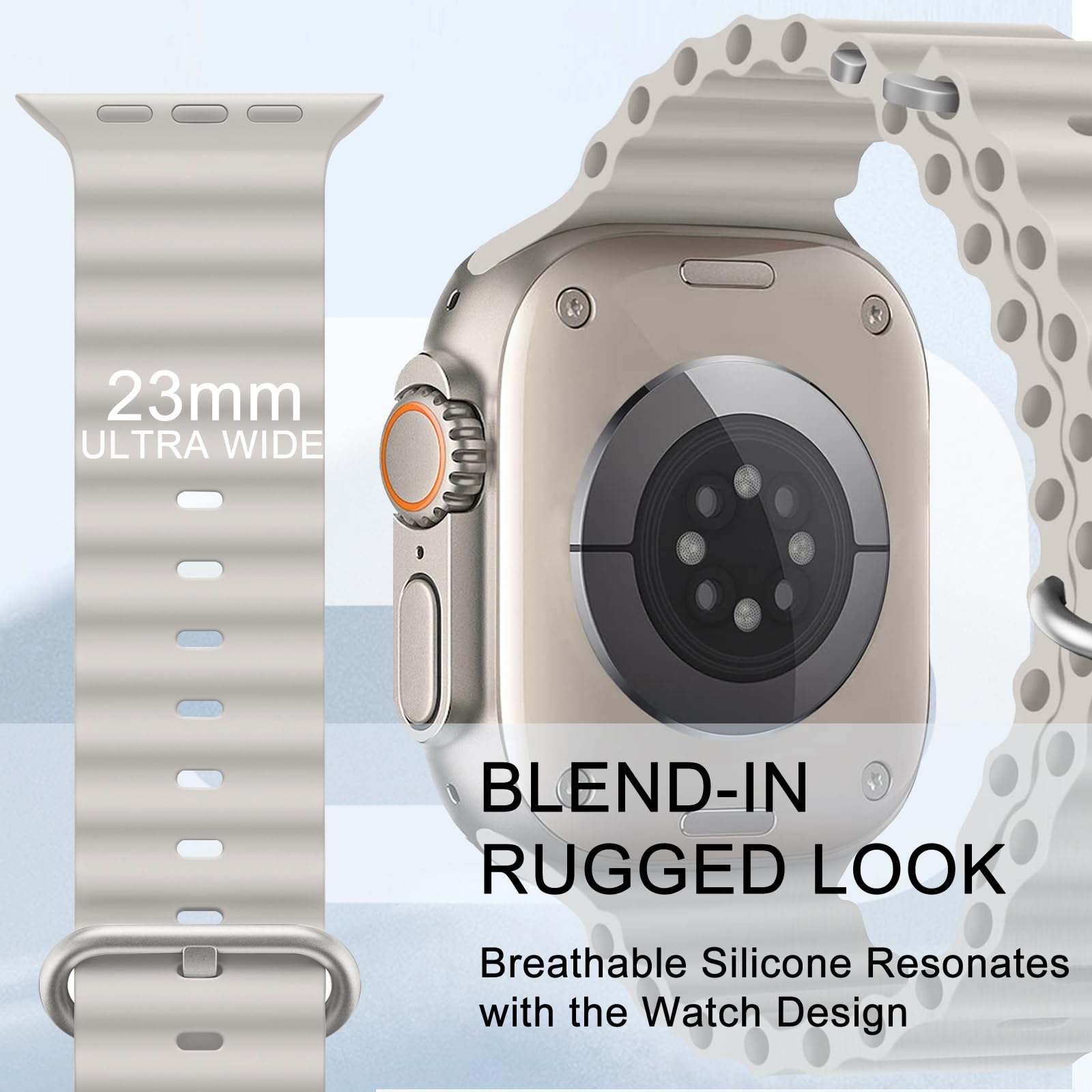 - Premium Material The sea is calling. Ocean strap is ready for tough encounters on dangerous roads. Comfort for the long run. The iwatch Ultra 2 band Molded from a high-performance elastomer, it’s flexible and stretchy. The corrosion-resistant titanium buckle and spring loaded titanium adjustable loop secure the band, even during high-speed water sports