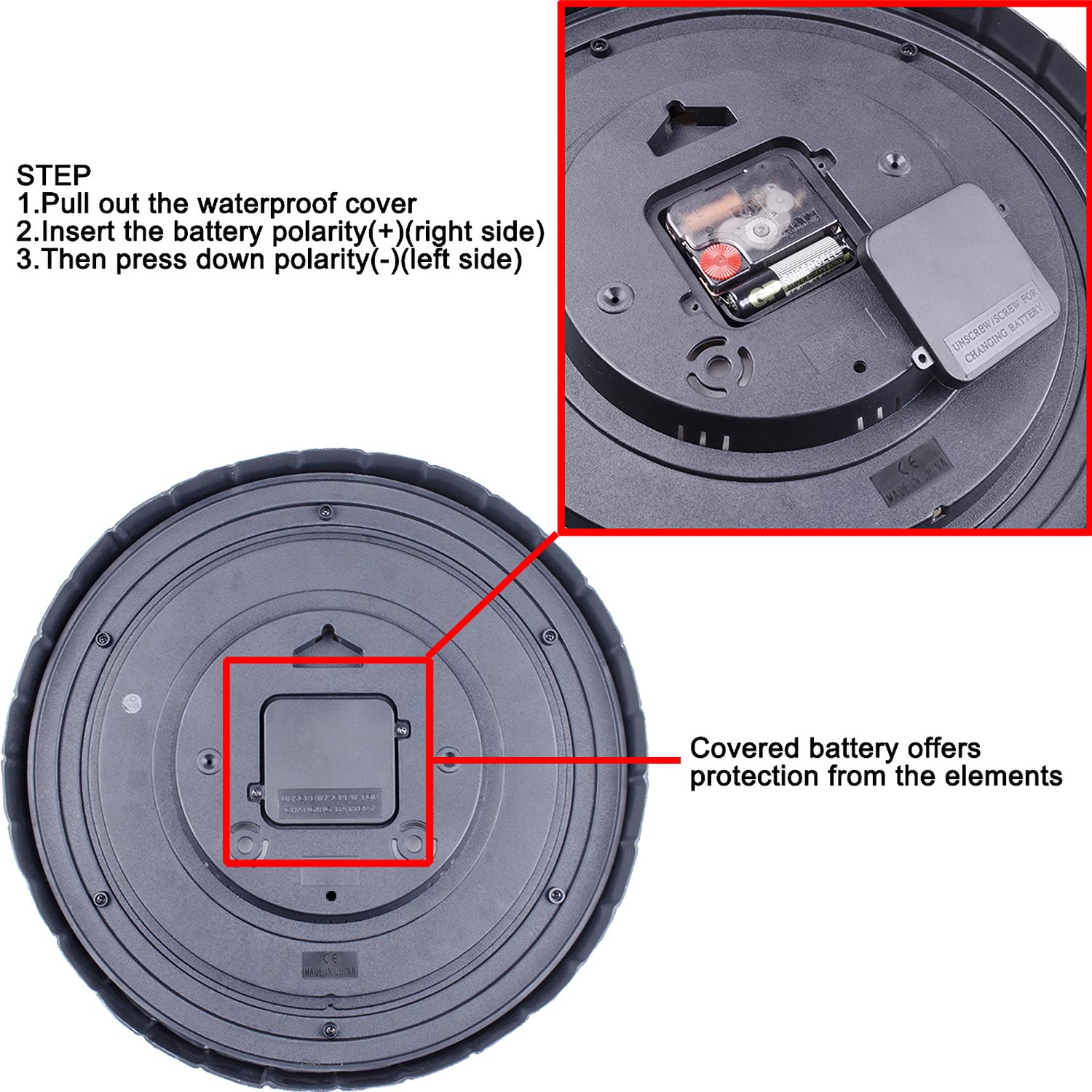 - Water & Weather Resistant: Waterproof outdoor clock has fine sealed with a rubber gasket cover, which is good to protect the front side and the quartz movement from rain. Clock face made with PVC, moisture avoiding, excellent faced to any weather at outdoor