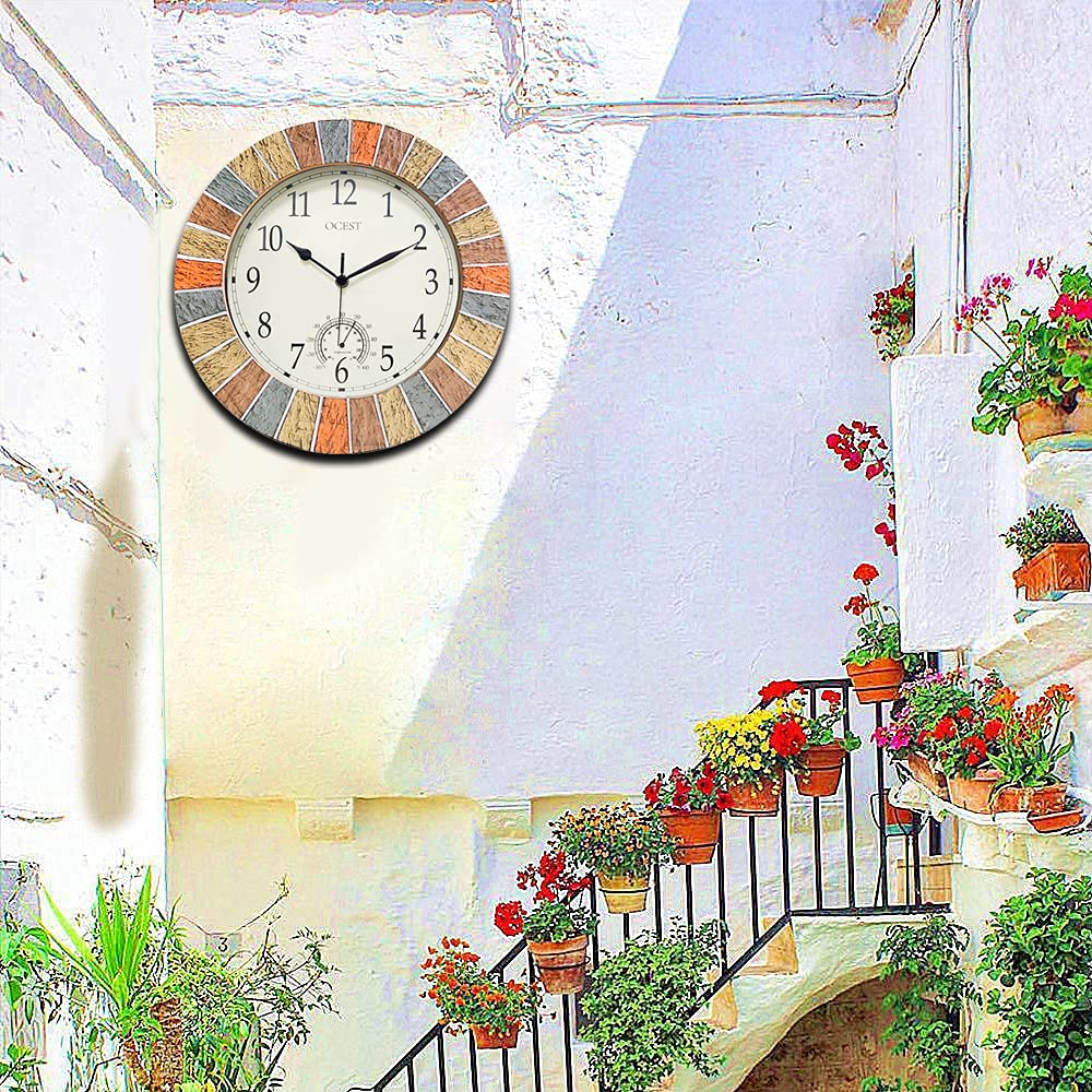 The OCEST outdoor silent quartz wall clock back base are made of premium plastic with Waterproof rear cover & Front rubber that can keep well function and dry in any weather condition, instead of using cardboard as clock background. It's not easy damaged in moisture and wet condition.